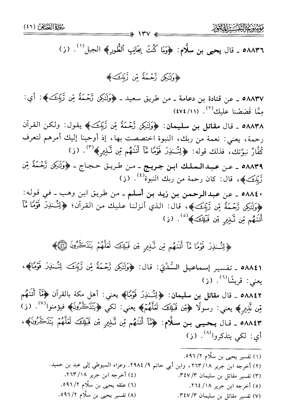 ٥٨٨٤١ - تفسير إسماعيل السُّدِّيّ: قال: {ولكن رحمة من ربك لتنذر قوما}، يعني: قريشًا (¬٦). (ز)