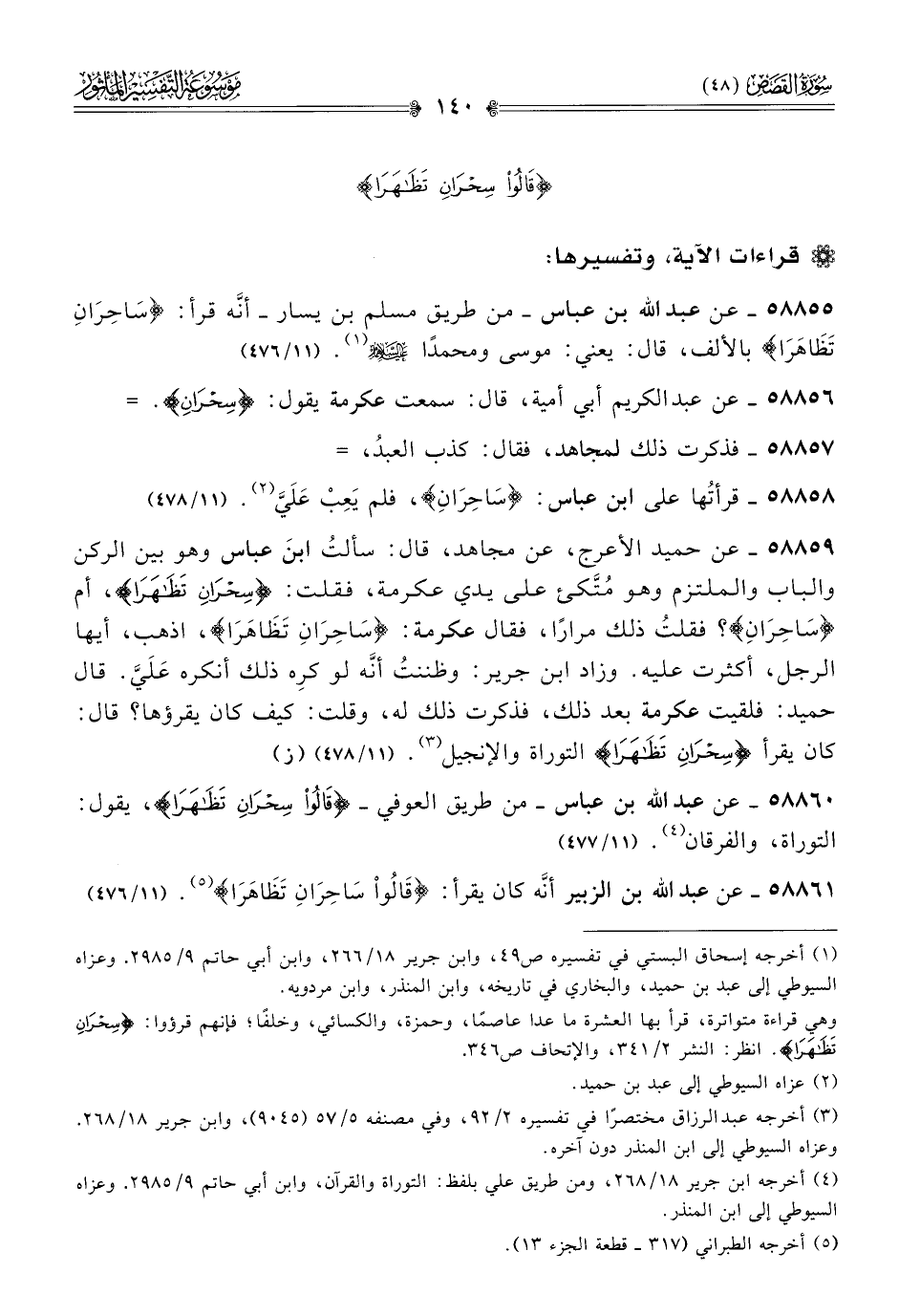 ٥٨٨٦٠ - عن عبد الله بن عباس -من طريق العوفي- {قالُواْ سِحْرانِ تَظاهَرا}، يقول: التوراة، والفرقان (¬٤). (١١/ ٤٧٧)