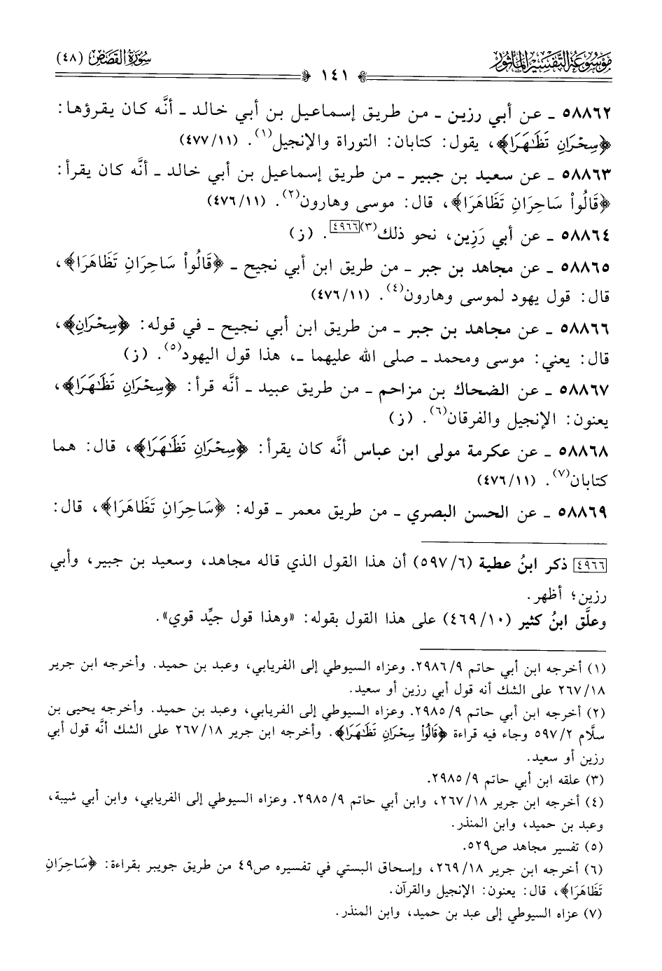 (¬٢) أخرجه ابن أبي حاتم ٩/ ٢٩٨٥. وعزاه السيوطي إلى الفريابي، وعبد بن حميد. وأخرجه يحيى بن سلّام ٢/ ٥٩٧ وجاء فيه قراءة {قالوا سحران تظاهرا}. وأخرجه ابن جرير ١٨/ ٢٦٧ على الشك أنّه قول أبي رزين أو سعيد.