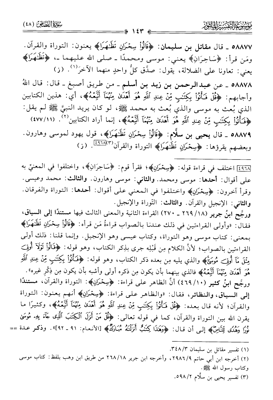 ٥٨٨٧٩ - قال يحيى بن سلّام: {قالُواْ سِحْرانِ تَظاهَرا}، قول يهود لموسى وهارون. وبعضهم يقرؤها: {سِحْرانِ تَظاهَرا} التوراة والقرآن (¬٣) [٤٩٦٨]. (ز)