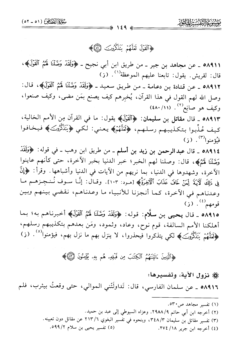 ٥٨٩١٢ - عن قتادة بن دعامة -من طريق سعيد- {ولقد وصلنا لهم القول}، قال: وصل الله لهم القول في هذا القرآن، يُخبِرهم كيف يصنع بمَن مضى، وكيف صنعوا، وكيف هو صانِع (¬٢). (١١/ ٤٨٠)