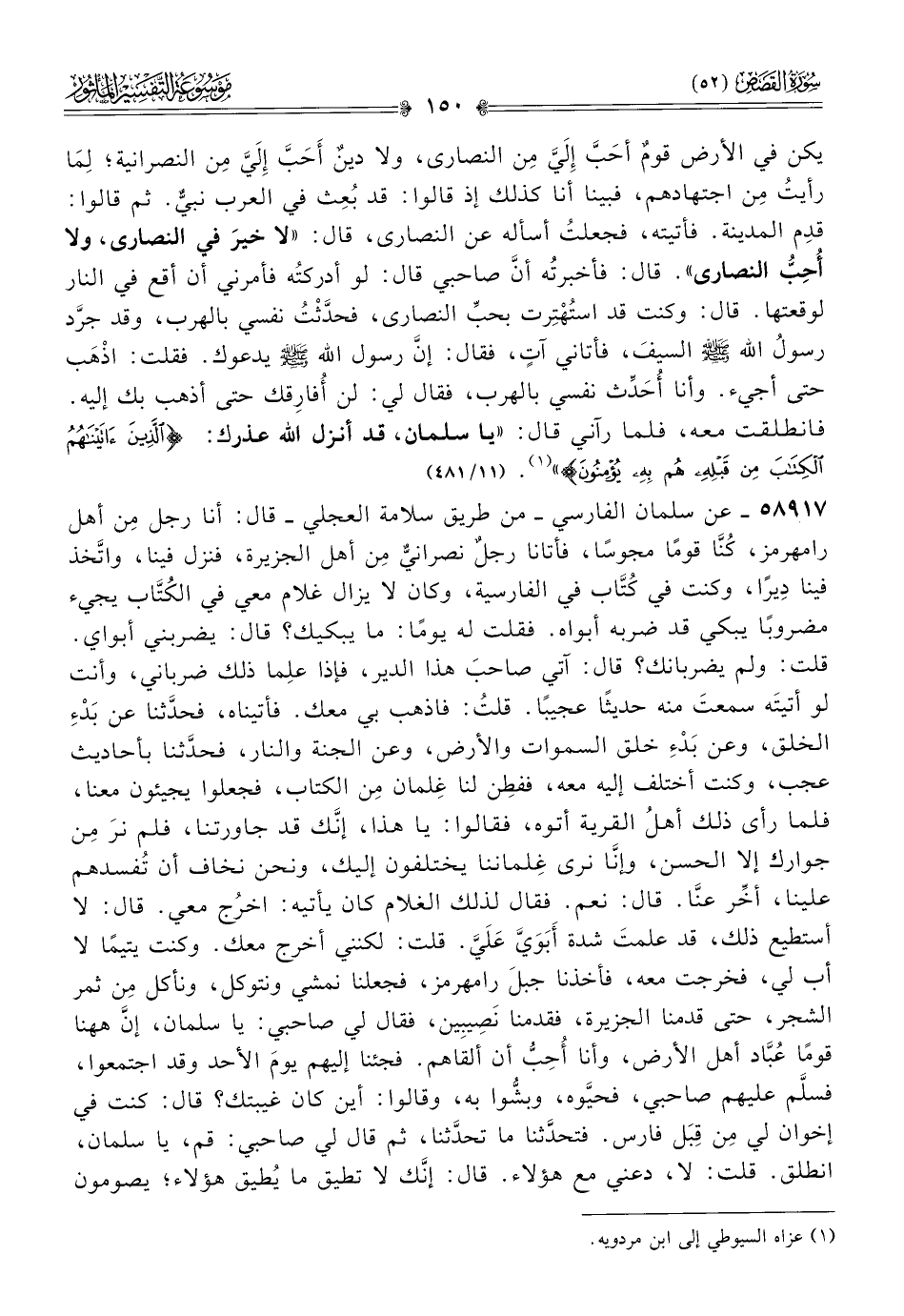 ٥٨٩١٧ - عن سلمان الفارسي -من طريق سلامة العجلي- قال: أنا رجل مِن أهل رامهرمز، كُنّا قومًا مجوسًا، فأتانا رجلٌ نصرانيٌّ مِن أهل الجزيرة، فنزل فينا، واتَّخذ فينا دِيرًا، وكنت في كُتّاب في الفارسية، وكان لا يزال غلام معي في الكُتّاب يجيء مضروبًا يبكي قد ضربه أبواه. فقلت له يومًا: ما يبكيك؟ قال: يضربني أبواي. قلت: ولم يضربانك؟ قال: آتي صاحبَ هذا الدير، فإذا علِما ذلك ضرباني، وأنت لو أتيتَه سمعتَ منه حديثًا عجيبًا. قلتُ: فاذهب بي معك. فأتيناه، فحدَّثنا عن بَدْءِ الخلق، وعن بَدْءِ خلق السموات والارض، وعن الجنة والنار، فحدَّثنا بأحاديث عجب، وكنت أختلف إليه معه، ففطِن لنا غِلمان مِن الكتاب، فجعلوا يجيئون معنا، فلما رأى ذلك أهلُ القرية أتوه، فقالوا: يا هذا، إنّك قد جاورتنا، فلم نرَ مِن جوارك إلا الحسن، وإنّا نرى غِلماننا يختلفون إليك، ونحن نخاف أن تُفسدهم علينا، أخِّر عنّا. قال: نعم. فقال لذلك الغلام كان يأتيه: اخرُج معي. قال: لا أستطيع ذلك، قد علمتَ شدة أبَوَيَّ عَلَيَّ. قلت: لكنني أخرج معك. وكنت يتيمًا لا أب لي، فخرجت معه، فأخذنا جبلَ رامهرمز، فجعلنا نمشي ونتوكل، ونأكل مِن ثمر الشجر، حتى قدمنا الجزيرة، فقدمنا نَصِيبِين، فقال لي صاحبي: يا سلمان، إنّ ههنا قومًا عُبّاد أهل الأرض، وأنا أُحِبُّ أن ألقاهم. فجئنا إليهم يومَ الأحد وقد اجتمعوا، فسلَّم عليهم صاحبي، فحيَّوه، وبشُّوا به، وقالوا: أين كان غيبتك؟ قال: كنت في إخوان لي مِن قِبَل فارس. فتحدَّثنا ما تحدَّثنا، ثم قال لي صاحبي: قم، يا سلمان، انطلق. قلت: لا، دعني مع هؤلاء. قال: إنّك لا تطيق ما يُطيق هؤلاء؛ يصومون