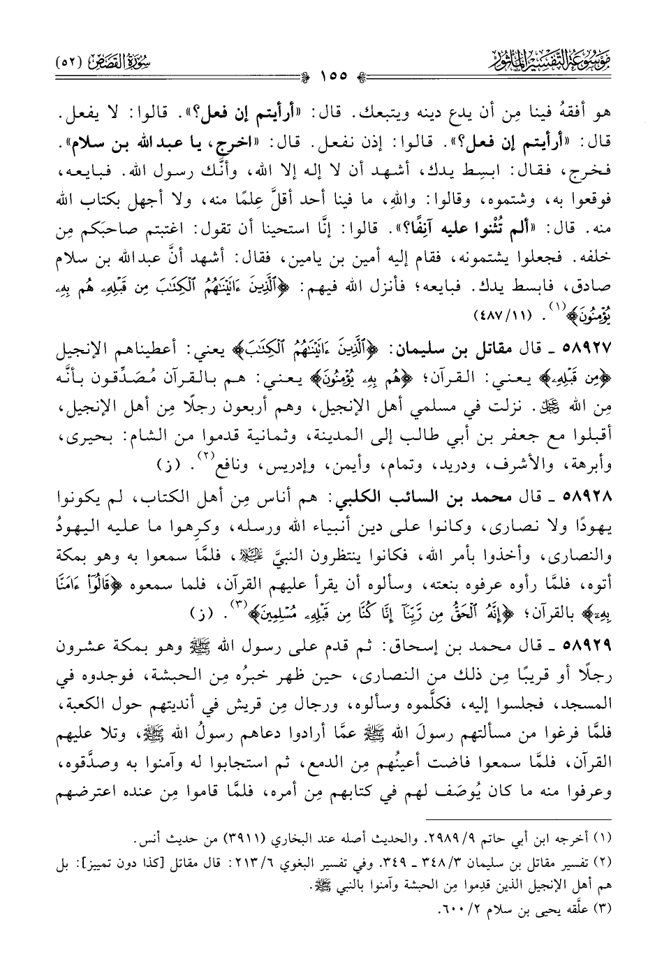 (¬٢) تفسير مقاتل بن سليمان ٣/ ٣٤٨ - ٣٤٩. وفي تفسير البغوي ٦/ ٢١٣: قال مقاتل [كذا دون تمييز]: بل هم أهل الإنجيل الذين قدِموا مِن الحبشة وآمنوا بالنبي - صلى الله عليه وسلم -.