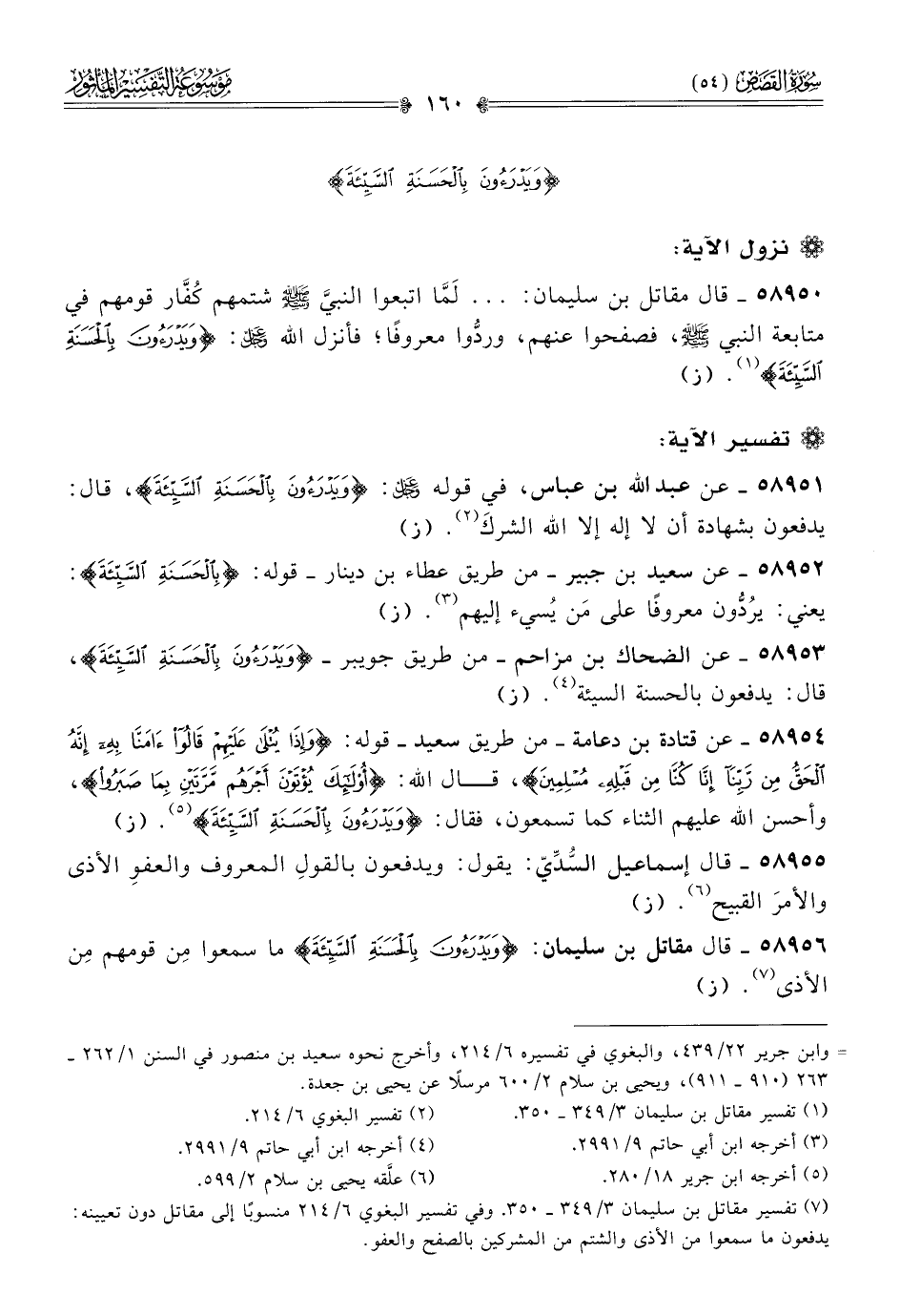 ٥٨٩٥٢ - عن سعيد بن جبير -من طريق عطاء بن دينار- قوله: {بالحسنة السيئة}: يعني: يرُدُّون معروفًا على مَن يُسيء إليهم (¬٣). (ز)