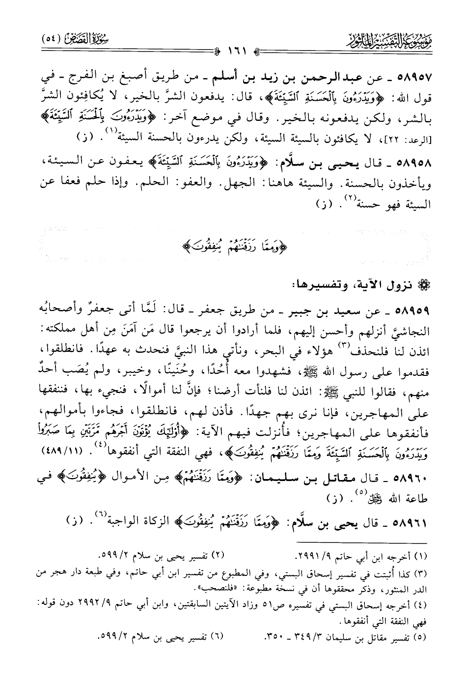 ٥٨٩٥٨ - قال يحيى بن سلّام: {ويدرءون بالحسنة السيئة} يعفون عن السيئة، ويأخذون بالحسنة. والسيئة هاهنا: الجهل. والعفو: الحلم. وإذا حلم فعفا عن السيئة فهو حسنة (¬٢). (ز)