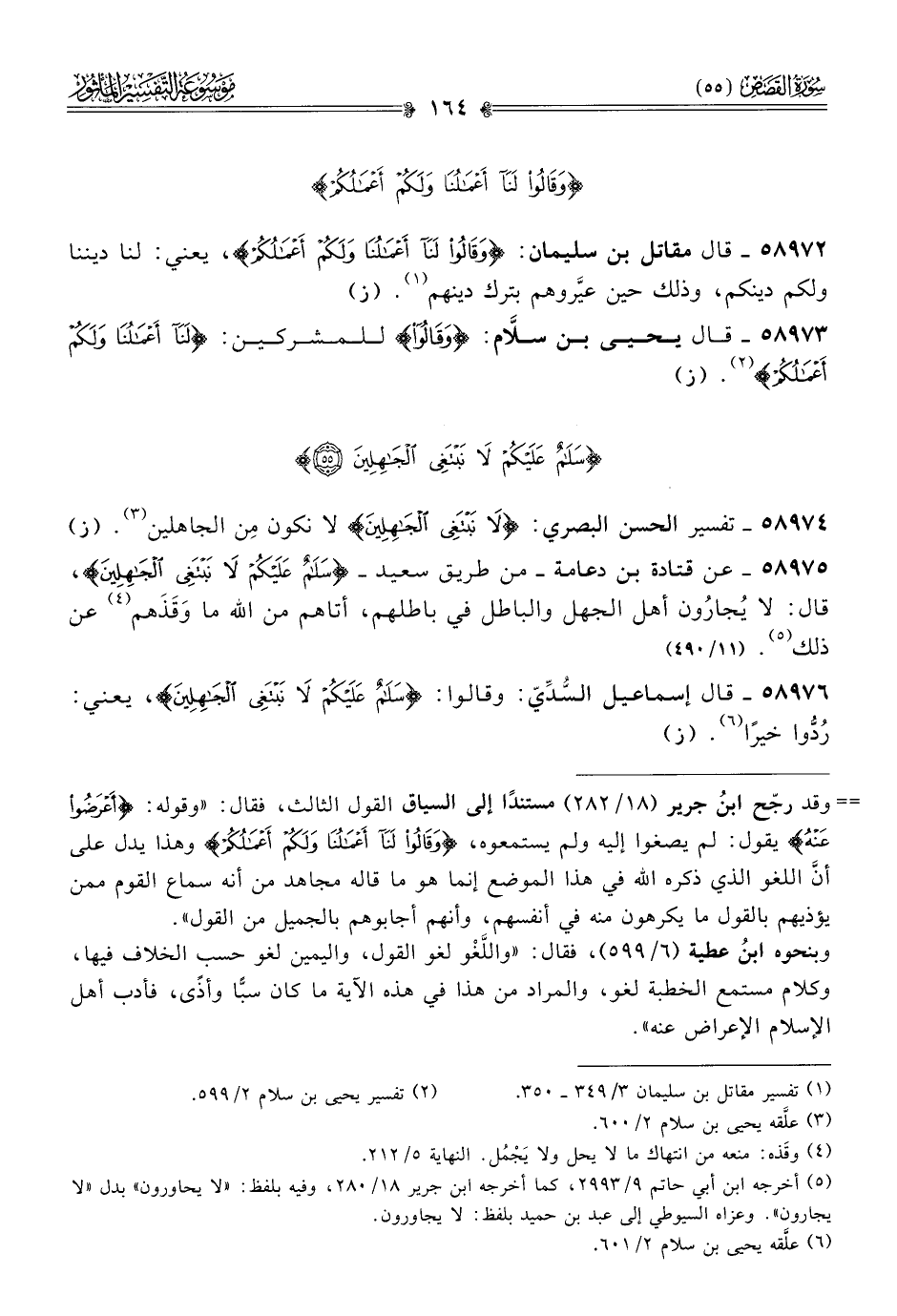 ٥٨٩٧٦ - قال إسماعيل السُّدِّيّ: وقالوا: {سلام عليكم لا نبتغي الجاهلين}، يعني: رُدُّوا خيرًا (¬٦). (ز)