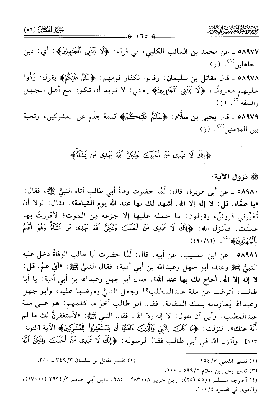 ٥٨٩٨١ - عن ابن المسيب، عن أبيه، قال: لَمّا حضرت أبا طالب الوفاةُ دخل عليه النبيُّ - صلى الله عليه وسلم - وعنده أبو جهل وعبد الله بن أبي أمية، فقال النبيُّ - صلى الله عليه وسلم -: «أيْ عمِّ، قل: لا إله إلا الله. أحاج لك بها عند الله». فقال أبو جهل وعبد الله بن أبي أمية: يا أبا طالب، أترغب عن ملة عبد المطلب؟! وجعل النبيُّ يعرضها عليه، وأبو جهل وعبد الله يُعاوِنانه بتلك المقالة. فقال أبو طالب آخرَ ما كلمهم: هو على ملة عبد المطلب. وأبى أن يقول: لا إله إلا الله. فقال النبي - صلى الله عليه وسلم -: «لأستغفرنَّ لك ما لم أُنْهَ عنك». فنزلت: {ما كان للنبي والذين آمنوا أن يستغفروا للمشركين} الآية [التوبة: ١١٣]. وأنزل الله في أبي طالب فقال لرسوله: {إنك لا تهدي من أحببت ولكن الله