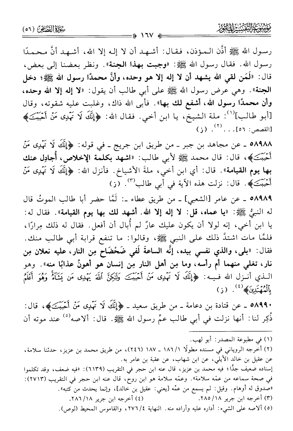 ٥٨٩٨٩ - عن عامر [الشعبي]-من طريق عطاء-: لَمّا حضر أبا طالب الموتُ قال له النبيُّ - صلى الله عليه وسلم -: «يا عماه، قل: لا إله إلا الله. أشهد لك بها يوم القيامة». فقال له: يا ابن أخي، إنه لولا أن يكون عليك عارٌ لم أُبال أن أفعل. فقال له ذلك مِرارًا، فلمّا مات اشتدَّ ذلك على النبي - صلى الله عليه وسلم -، وقالوا: ما تنفع قرابة أبي طالب منك. فقال: «بلى، والذي نفسي بيده، إنّه الساعةَ لَفي ضَحْضاح مِن النار، عليه نعلان مِن نار، تغلي منهما أم رأسه، وما مِن أهل النار مِن إنسان هو أهونُ عذابًا منه». وهو الذي أنزل الله فيه: {إنك لا تهدي من أحببت، ولكن الله يهدي من يشاء وهو أعلم بالمهتدين} (¬٤). (ز)