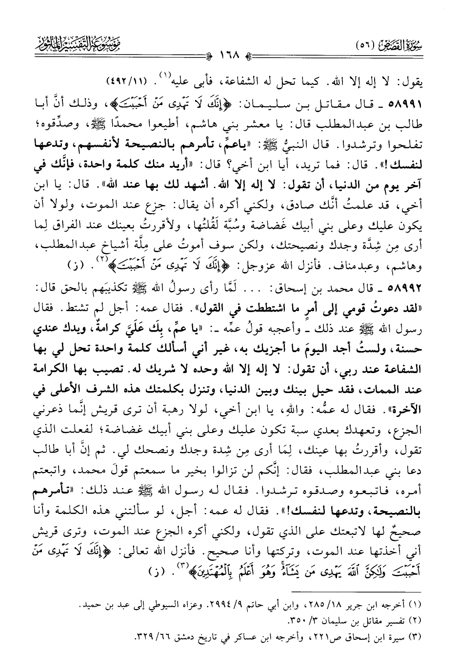 ٥٨٩٩١ - قال مقاتل بن سليمان: {إنك لا تهدي من أحببت}، وذلك أنّ أبا طالب بن عبد المطلب قال: يا معشر بني هاشم، أطيعوا محمدًا - صلى الله عليه وسلم -، وصدِّقوه؛ تفلحوا وترشدوا. قال النبيُّ - صلى الله عليه وسلم -: «ياعمِّ، تأمرهم بالنصيحة لأنفسهم، وتدعها لنفسك!». قال: فما تريد، أيا ابن أخي؟ قال: «أريد منك كلمة واحدة، فإنّك في آخر يوم من الدنيا، أن تقول: لا إله إلا الله. أشهد لك بها عند الله». قال: يا ابن أخي، قد علمتُ أنّك صادق، ولكني أكره أن يقال: جزِع عند الموت، ولولا أن يكون عليك وعلى بني أبيك غَضاضة وسُبَّة لَقُلتُها، ولأقررتُ بعينك عند الفراق لِما أرى مِن شِدَّة وجدك ونصيحتك، ولكن سوف أموتُ على مِلَّة أشياخ عبد المطلب، وهاشم، وعبد مناف. فأنزل الله عزوجل: {إنك لا تهدي من أحببت} (¬٢). (ز)