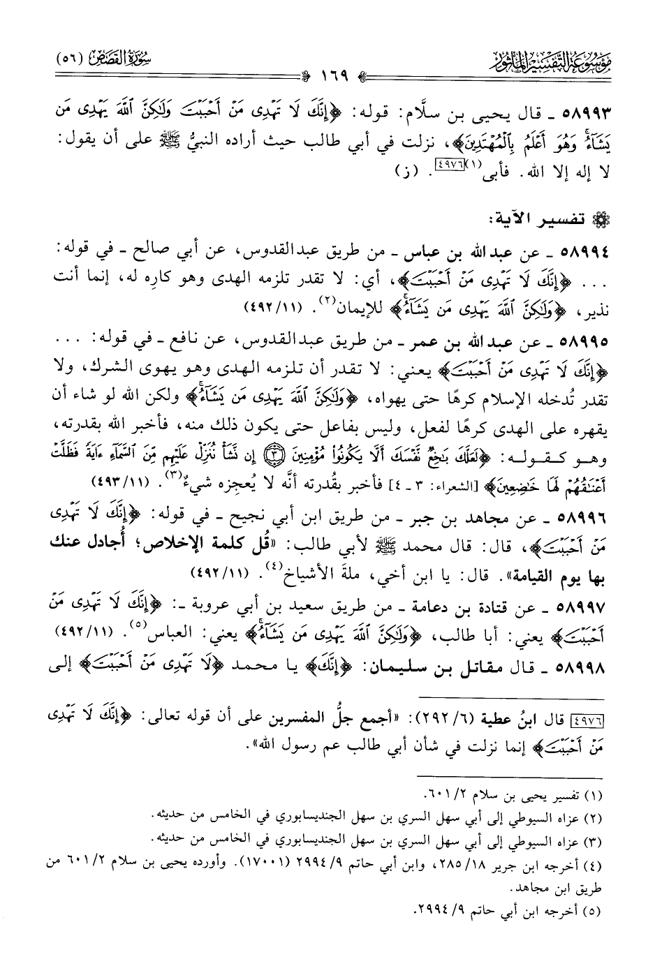 ٥٨٩٩٣ - قال يحيى بن سلّام: قوله: {إنك لا تهدي من أحببت ولكن الله يهدي من يشاء وهو أعلم بالمهتدين}، نزلت في أبي طالب حيث أراده النبيُّ - صلى الله عليه وسلم - على أن يقول: لا إله إلا الله. فأبى (¬١) [٤٩٧٦]. (ز)