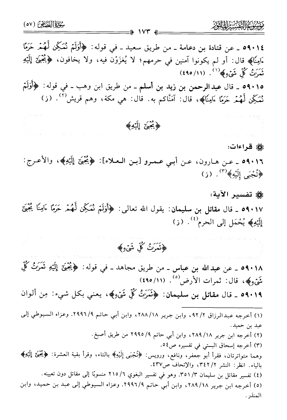 ٥٩٠١٧ - قال مقاتل بن سليمان: يقول الله تعالى: {أولم نمكن لهم حرما آمنا يجبى إليه} يُحْمَل إلى الحرم (¬٤). (ز)