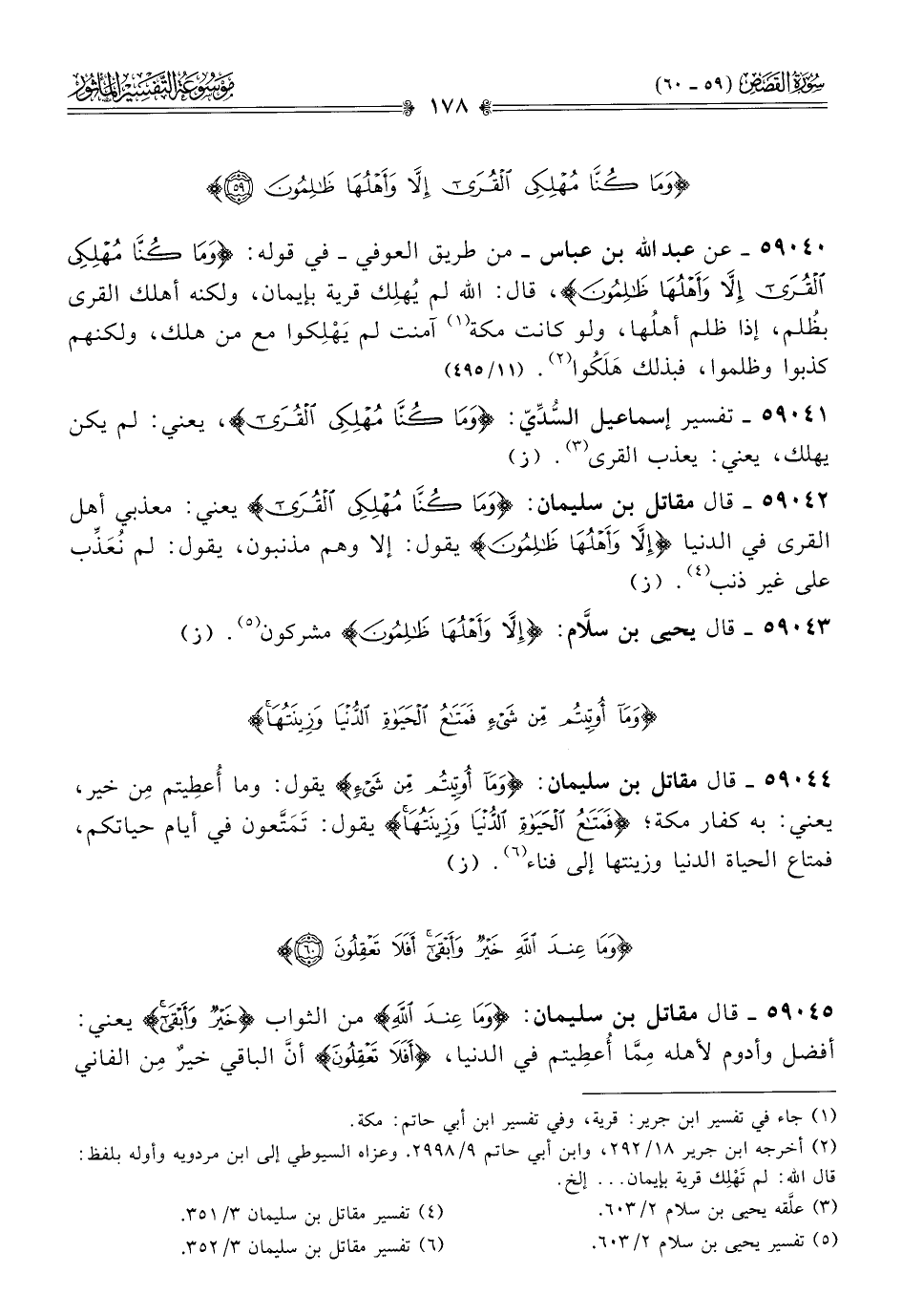 ٥٩٠٤٢ - قال مقاتل بن سليمان: {وما كنا مهلكي القرى} يعني: معذبي أهل القرى في الدنيا {إلا وأهلها ظالمون} يقول: إلا وهم مذنبون، يقول: لم نُعَذِّب على غير ذنب (¬٤). (ز)