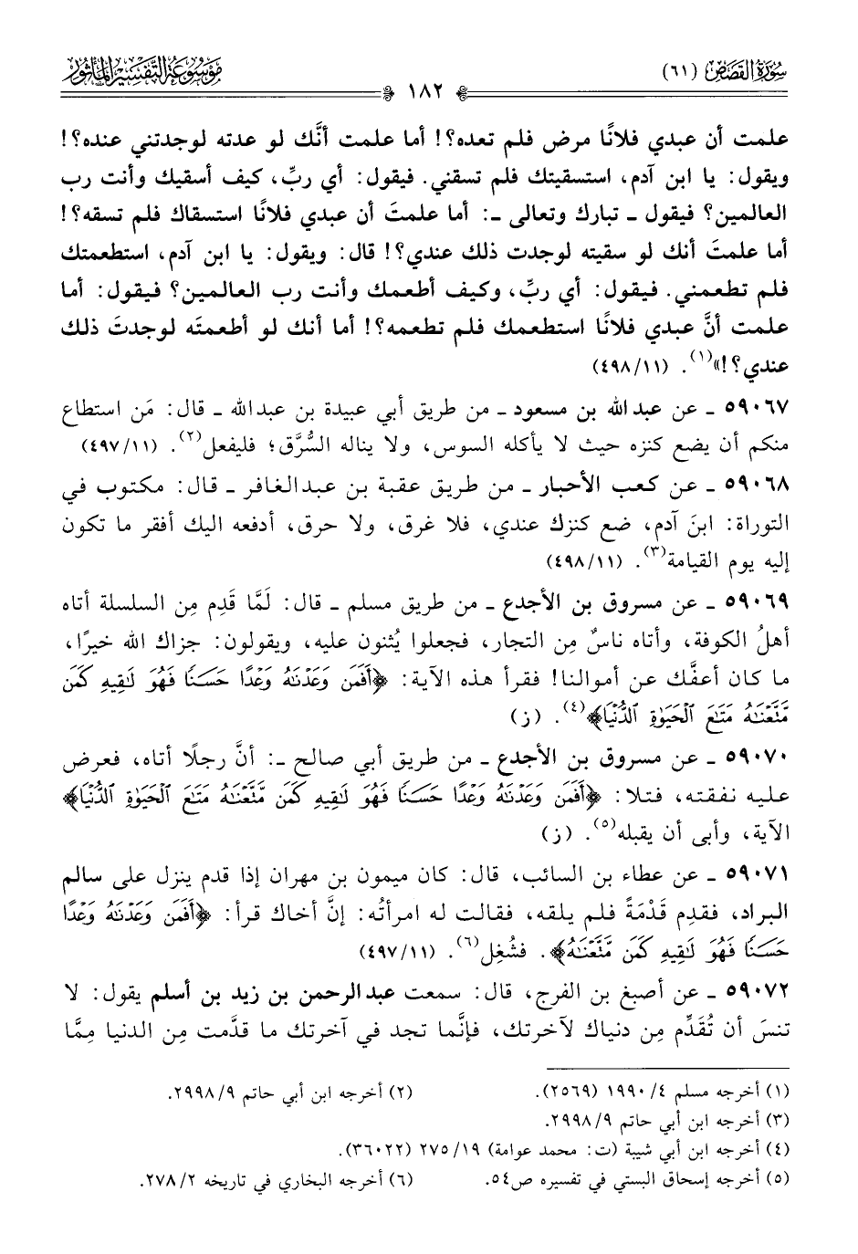 ٥٩٠٦٩ - عن مسروق بن الأجدع -من طريق مسلم- قال: لَمّا قَدِم مِن السلسلة أتاه أهلُ الكوفة، وأتاه ناسٌ مِن التجار، فجعلوا يُثنون عليه، ويقولون: جزاك الله خيرًا، ما كان أعفَّك عن أموالنا! فقرأ هذه الآية: {أفمن وعدناه وعدا حسنا فهو لاقيه كمن متعناه متاع الحياة الدنيا} (¬٤). (ز)