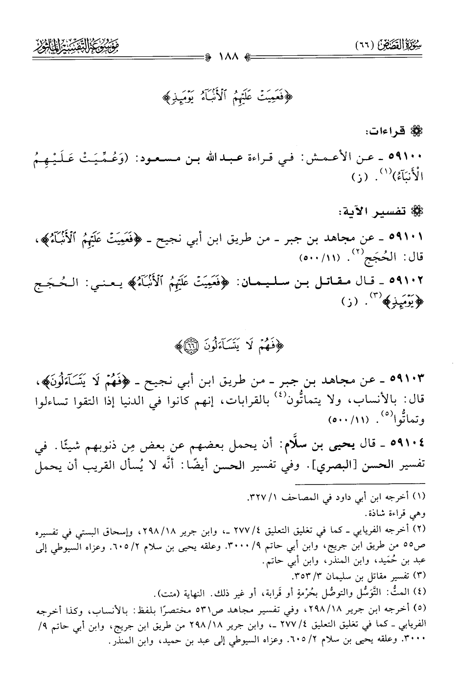 ٥٩١٠١ - عن مجاهد بن جبر -من طريق ابن أبي نجيح- {فعميت عليهم الأنباء}، قال: الحُجَج (¬٢). (١١/ ٥٠٠)