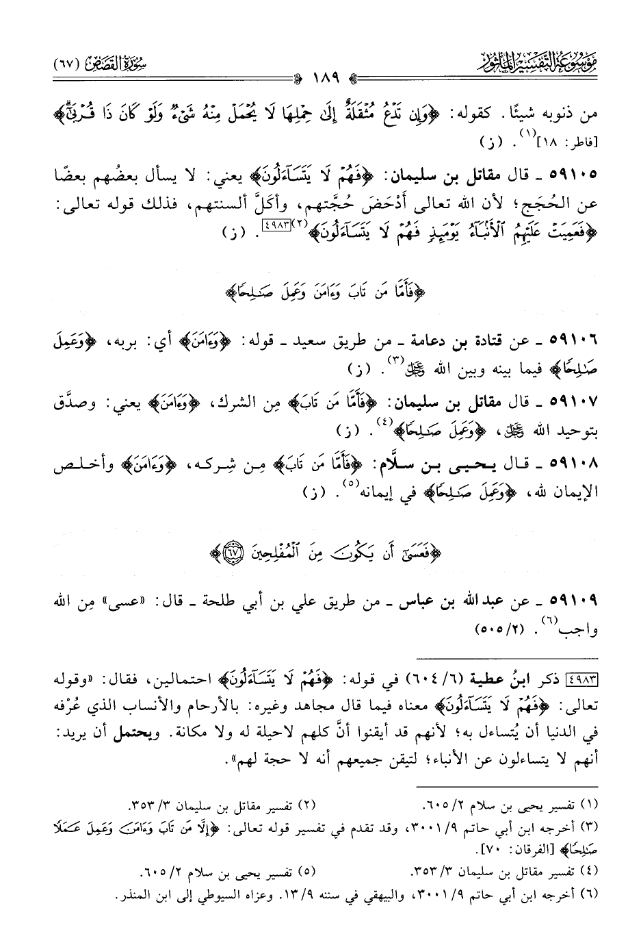 (¬٣) أخرجه ابن أبي حاتم ٩/ ٣٠٠١، وقد تقدم في تفسير قوله تعالى: {إلّا مَن تابَ وآمَنَ وعَمِلَ عَمَلًا صالِحًا} [الفرقان: ٧٠].