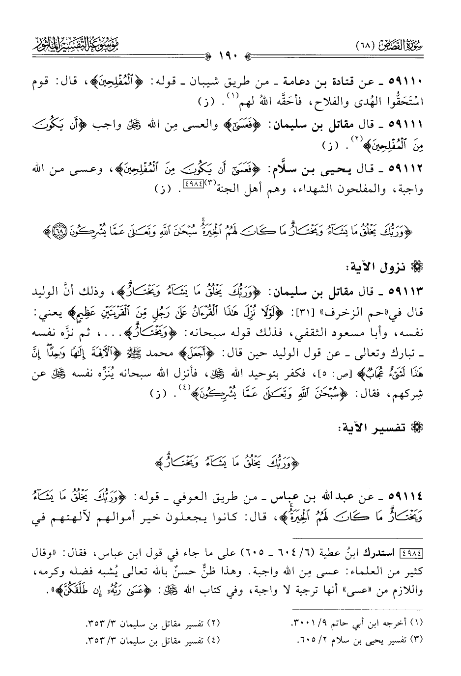 ٥٩١١٤ - عن عبد الله بن عباس -من طريق العوفي- قوله: {وربك يخلق ما يشاء ويختار ما كان لهم الخيرة}، قال: كانوا يجعلون خير أموالهم لآلهتهم في