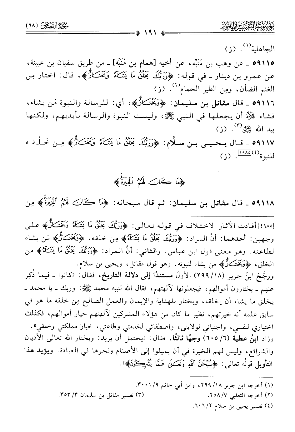 ٥٩١١٥ - عن وهب بن مُنَبِّه، عن أخيه [همام بن مُنَبِّه]-من طريق سفيان بن عيينة، عن عمرو بن دينار- في قوله: {وربك يخلق ما يشاء ويختار}، قال: اختار مِن الغنم الضأن، ومِن الطير الحمام (¬٢). (ز)