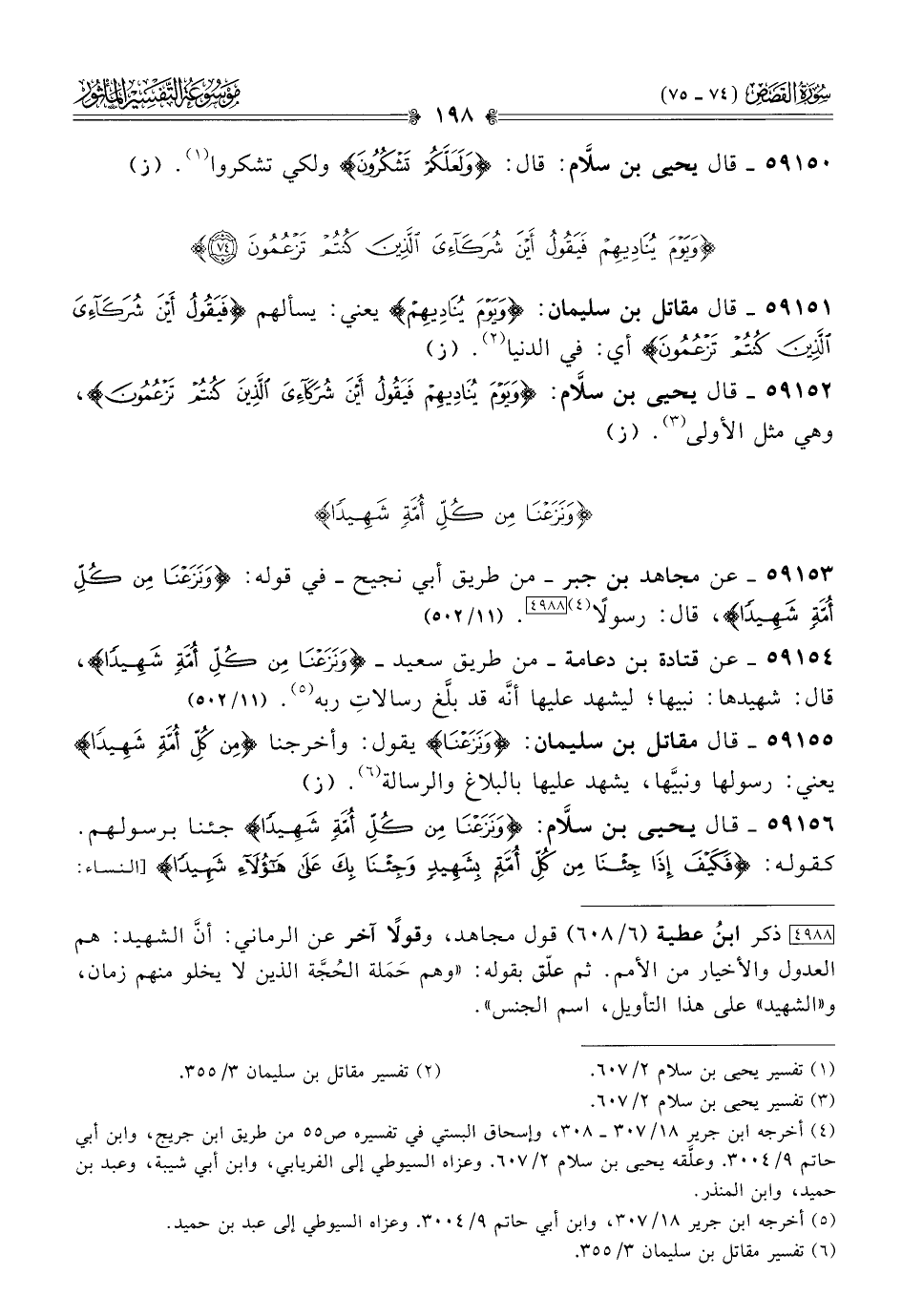 ٥٩١٥٣ - عن مجاهد بن جبر -من طريق أبي نجيح- في قوله: {ونزعنا من كل أمة شهيدا}، قال: رسولًا (¬٤) [٤٩٨٨].
