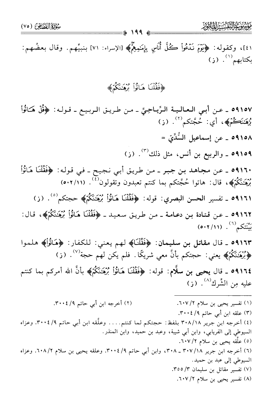 ٥٩١٦١ - تفسير الحسن البصري: قوله: {فقلنا هاتوا برهانكم} حجتكم (¬٥). (ز)