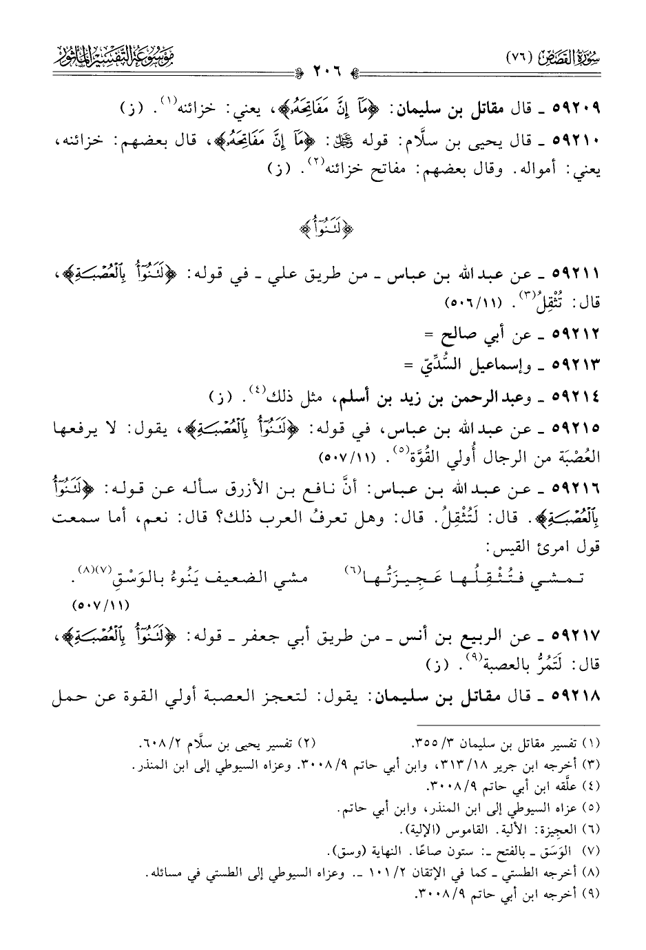 ٥٩٢١٠ - قال يحيى بن سلّام: قوله - عز وجل -: {ما إن مفاتحه}، قال بعضهم: خزائنه، يعني: أمواله. وقال بعضهم: مفاتح خزائنه (¬٢). (ز)
