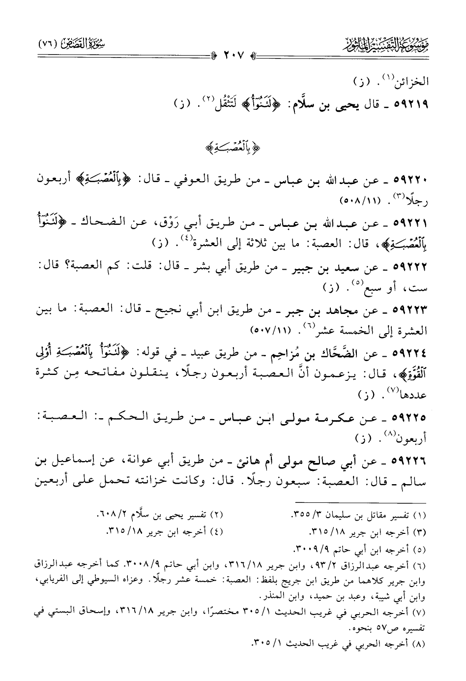 ٥٩٢٢٠ - عن عبد الله بن عباس -من طريق العوفي- قال: {بالعصبة} أربعون رجلًا (¬٣). (١١/ ٥٠٨)