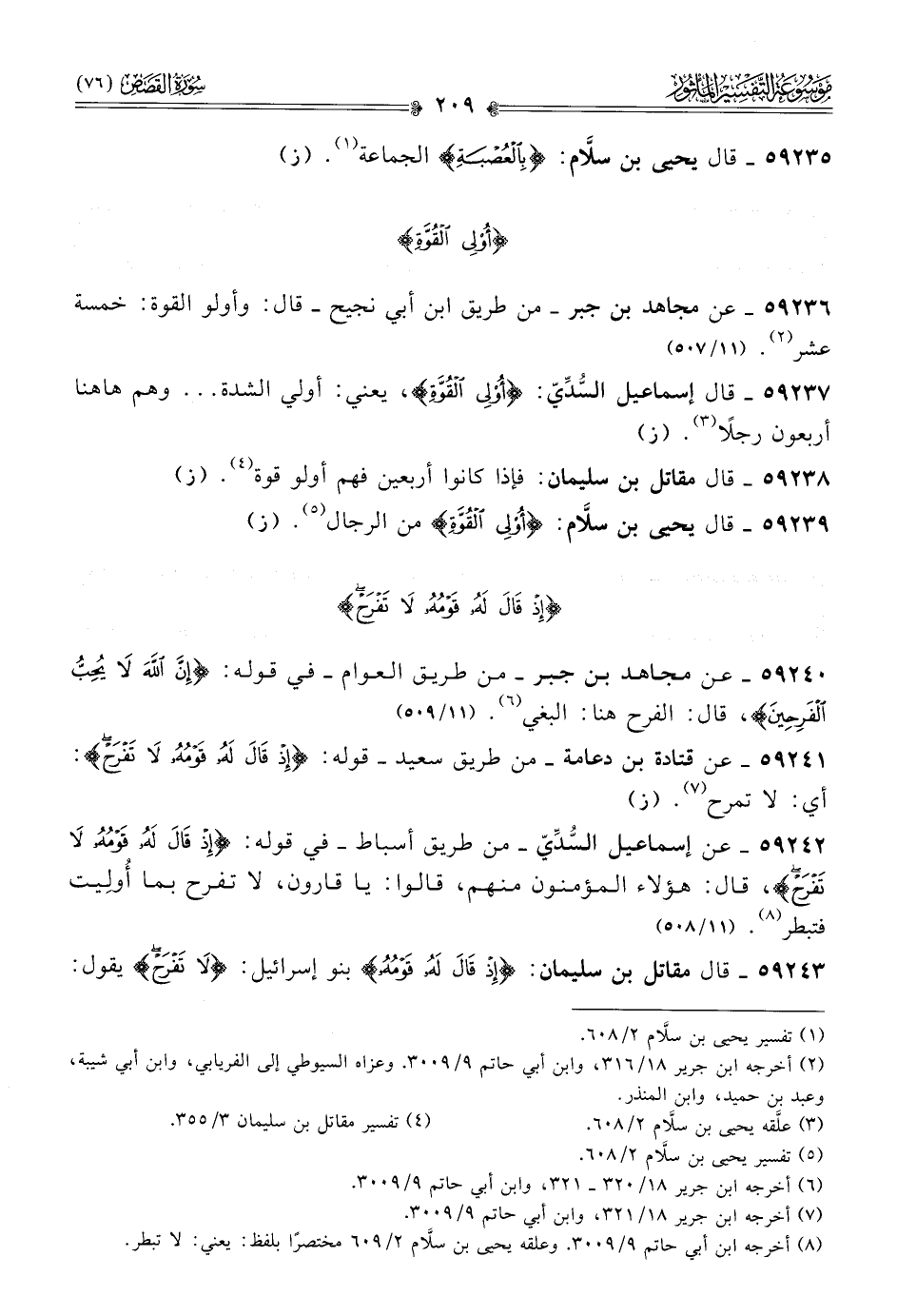 ٥٩٢٣٩ - قال يحيى بن سلّام: {أولي القوة} من الرجال (¬٥). (ز)