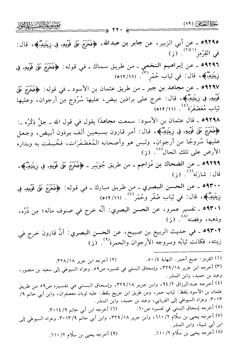 ٥٩٣٠٠ - عن الحسن البصري -من طريق مبارك- في قوله: {فخرج على قومه في زينته}، قال: في ثياب صُفْر وحُمْر (¬٧). (١١/ ٥١٢)