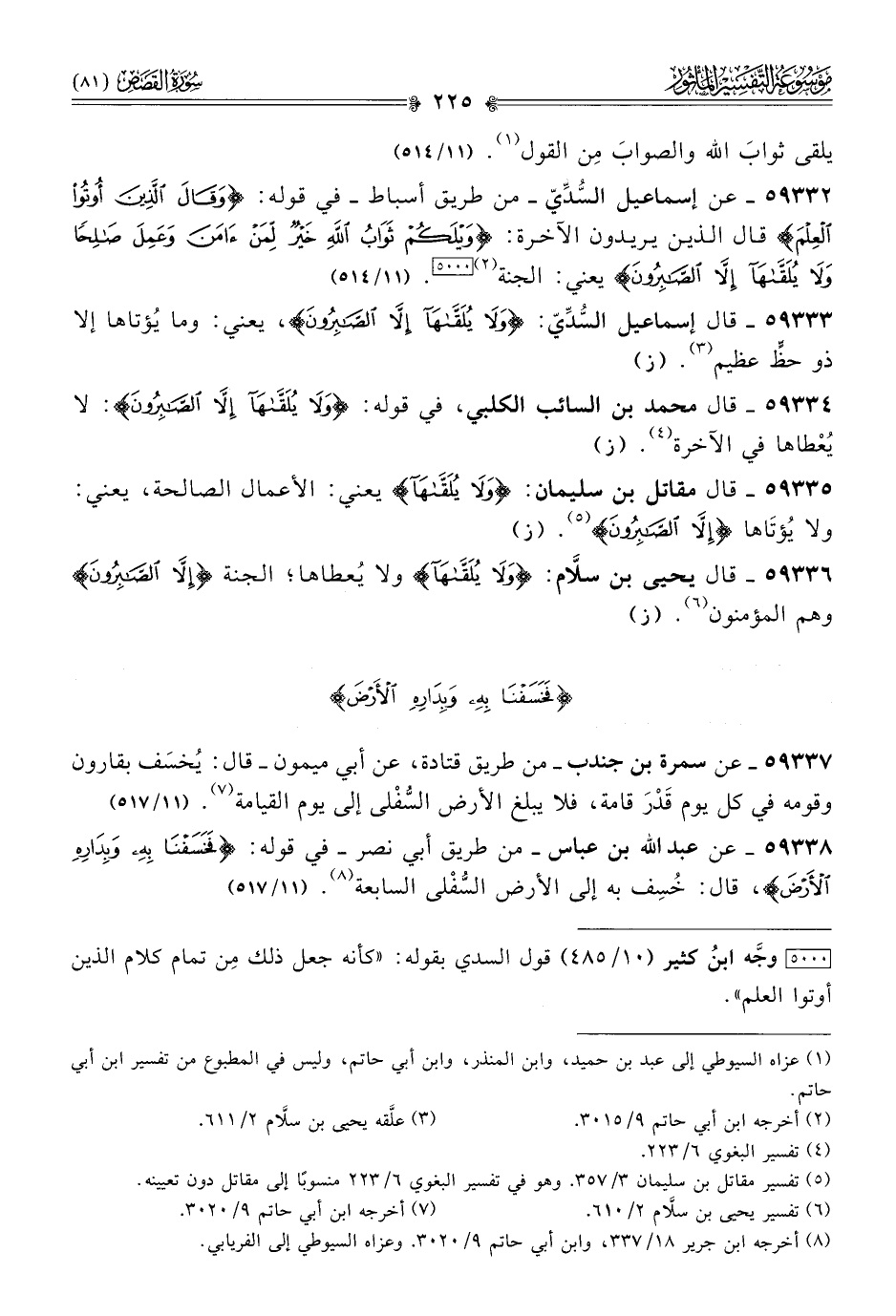 ٥٩٣٣٢ - عن إسماعيل السُّدِّيّ -من طريق أسباط- في قوله: {وقالَ الَّذِينَ أُوتُوا العِلْمَ} قال الذين يريدون الآخرة: {ويْلَكُمْ ثَوابُ اللَّهِ خَيْرٌ لِمَن آمَنَ وعَمِلَ صالِحًا ولا يلقاها إلا الصابرون} يعني: الجنة (¬٢) [٥٠٠٠]. (١١/ ٥١٤)