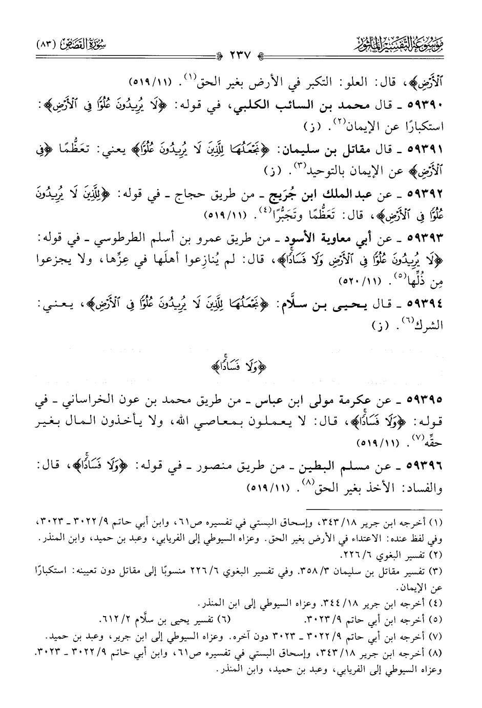 ٥٩٣٩٠ - قال محمد بن السائب الكلبي، في قوله: {لا يريدون علوا في الأرض}: استكبارًا عن الإيمان (¬٢). (ز)