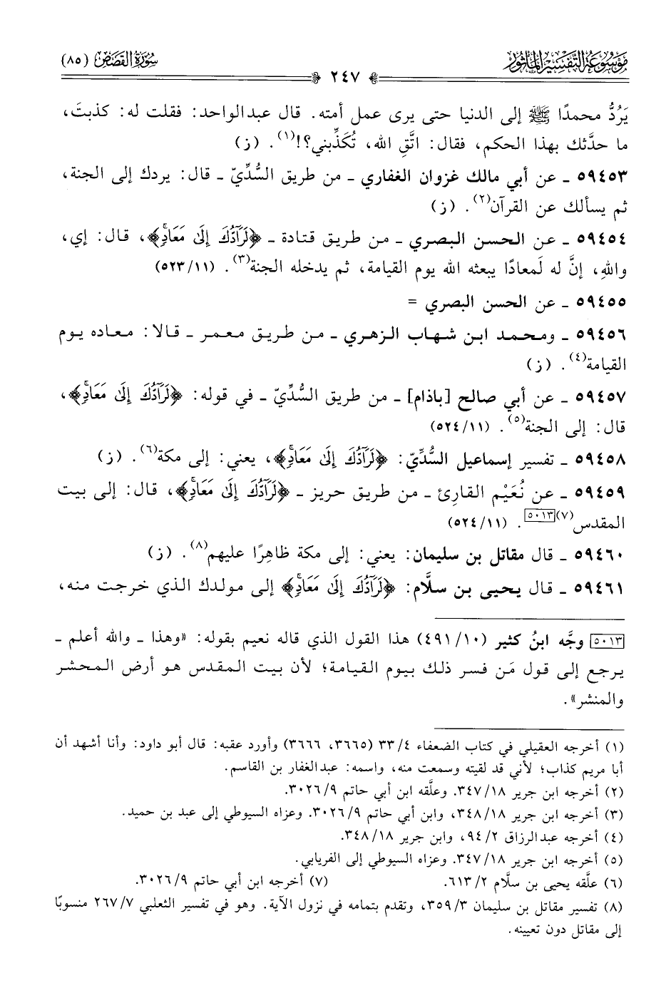 ٥٩٤٥٨ - تفسير إسماعيل السُّدِّيّ: {لرادك إلى معاد}، يعني: إلى مكة (¬٦). (ز)