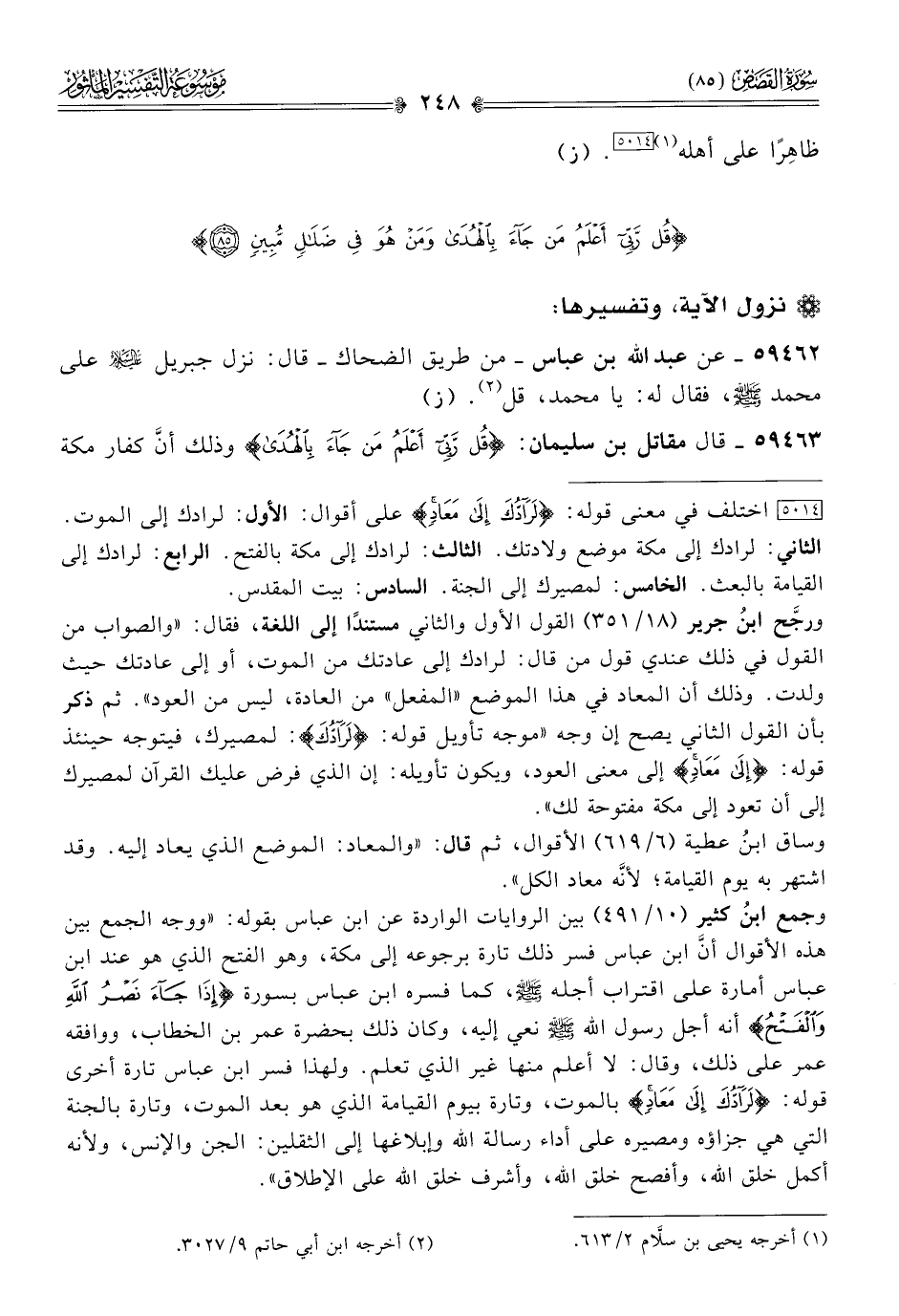 [٥٠١٤] اختلف في معنى قوله: {لرادك إلى معاد} على أقوال: الأول: لرادك إلى الموت. الثاني: لرادك إلى مكة موضع ولادتك. الثالث: لرادك إلى مكة بالفتح. الرابع: لرادك إلى القيامة بالبعث. الخامس: لمصيرك إلى الجنة. السادس: بيت المقدس.