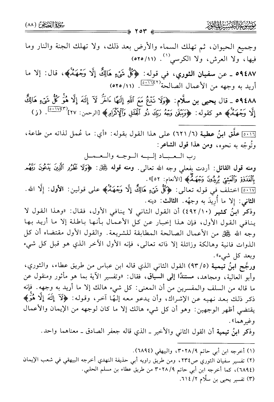 ٥٩٤٨٧ - عن سفيان الثوري، في قوله: {كل شيء هالك إلا وجهه}، قال: إلا ما أريد به وجهه من الأعمال الصالحة (¬٢) [٥٠١٦]. (١١/ ٥٢٥)