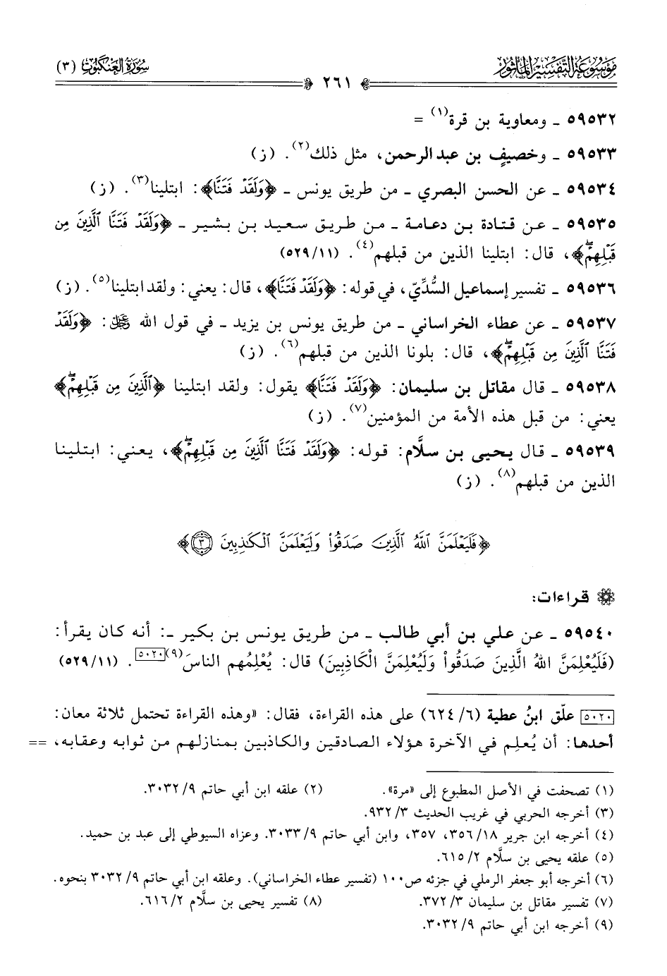 ٥٩٥٤٠ - عن علي بن أبي طالب -من طريق يونس بن بكير- أنه كان يقرأ: (فَلَيُعْلِمَنَّ اللهُ الَّذِينَ صَدَقُواْ ولَيُعْلِمَنَّ الكاذِبِينَ) قال: يُعْلِمُهم الناسَ (¬٩) [٥٠٢٠]. (١١/ ٥٢٩)