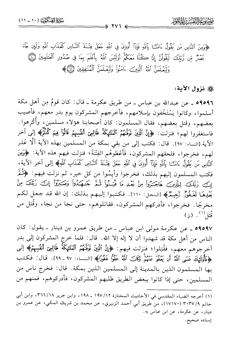 ٥٩٥٩٦ - عن عبد الله بن عباس -من طريق عكرمة- قال: كان قومٌ مِن أهل مكة أسلموا، وكانوا يَسْتَخْفون بإسلامهم، فأخرجهم المشركون يوم بدر معهم، فأصيب بعضهم، وقتل بعضهم، فقال المسلمون: كان أصحابنا هؤلاء مسلمين، وأُكْرِهوا. فاستغفروا لهم؛ فنزلت: {إن الذين توفاهم الملائكة ظالمي أنفسهم قالوا فيم كنتم} إلى آخر الآية [النساء: ٩٧]. قال: فكتب إلى من بقي بمكة من المسلمين بهذه الآية ألّا عُذر لهم، فخرجوا، فلحقهم المشركون، فَأَعْطَوهُم الفِتْنَةَ؛ فنزلت فيهم هذه الآية: {ومن الناس من يقول آمنا بالله، فإذا أوذي في الله جعل فتنة الناس كعذاب الله} إلى آخر الآية، فكتب المسلمون إليهم بذلك، فخرجوا وأيِسُوا من كل خير، ثم نزلت فيهم: {ثم إن ربك للذين هاجروا من بعد ما فتنوا، ثم جاهدوا وصبروا، إن ربك من بعدها لغفور رحيم} [النحل: ١١٠]. فكتبوا إليهم بذلك: إن الله قد جعل لكم مخرجًا. فخرجوا، فأدركهم المشركون، فقاتلوهم، حتى نجا من نجا، وقُتل من قُتل (¬١). (ز)
