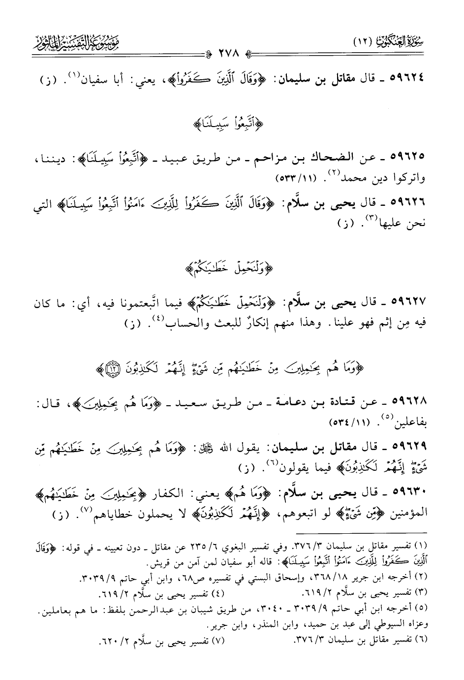 (¬١) تفسير مقاتل بن سليمان ٣/ ٣٧٦. وفي تفسير البغوي ٦/ ٢٣٥ عن مقاتل-دون تعيينه- في قوله: {وقال الذين كفروا للذين آمنوا اتبعوا سبيلنا}: قاله أبو سفيان لمن آمن من قريش.