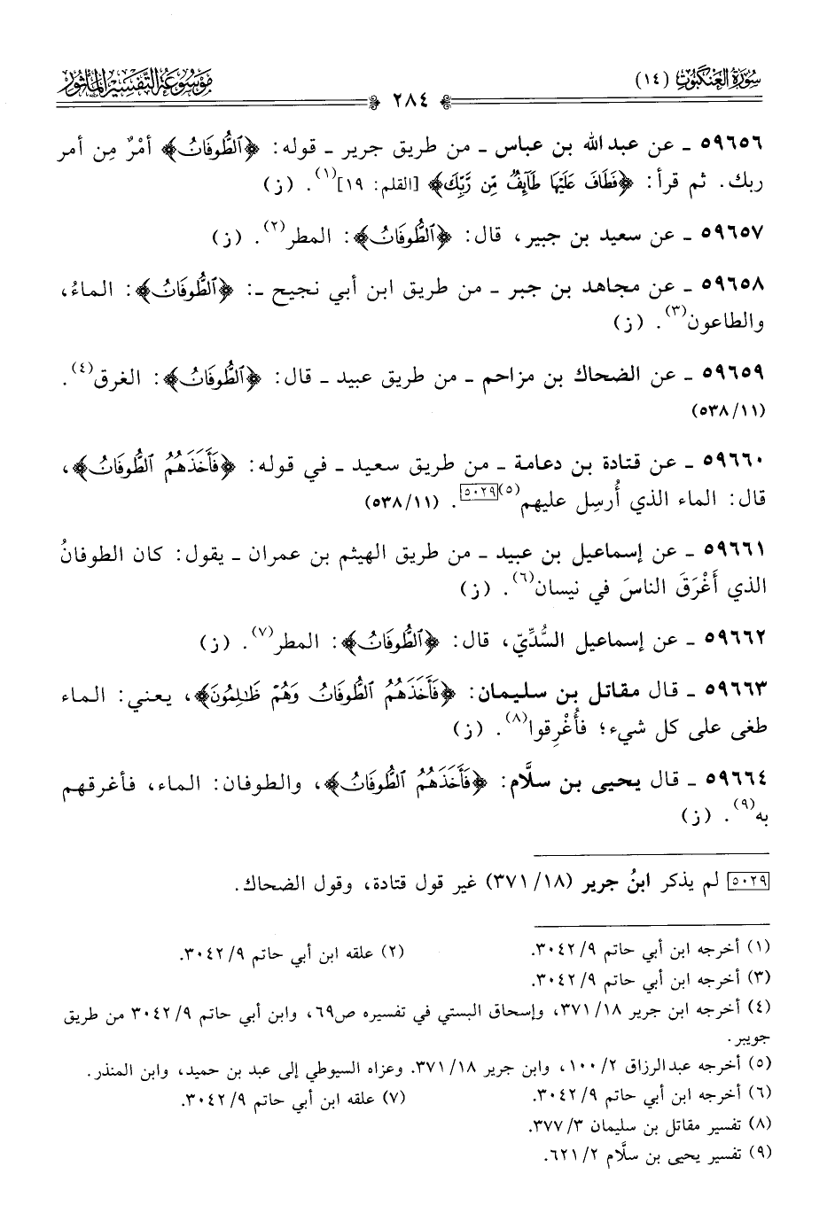 ٥٩٦٦٠ - عن قتادة بن دعامة -من طريق سعيد- في قوله: {فأخذهم الطوفان}، قال: الماء الذي أُرسِل عليهم (¬٥) [٥٠٢٩]. (١١/ ٥٣٨)