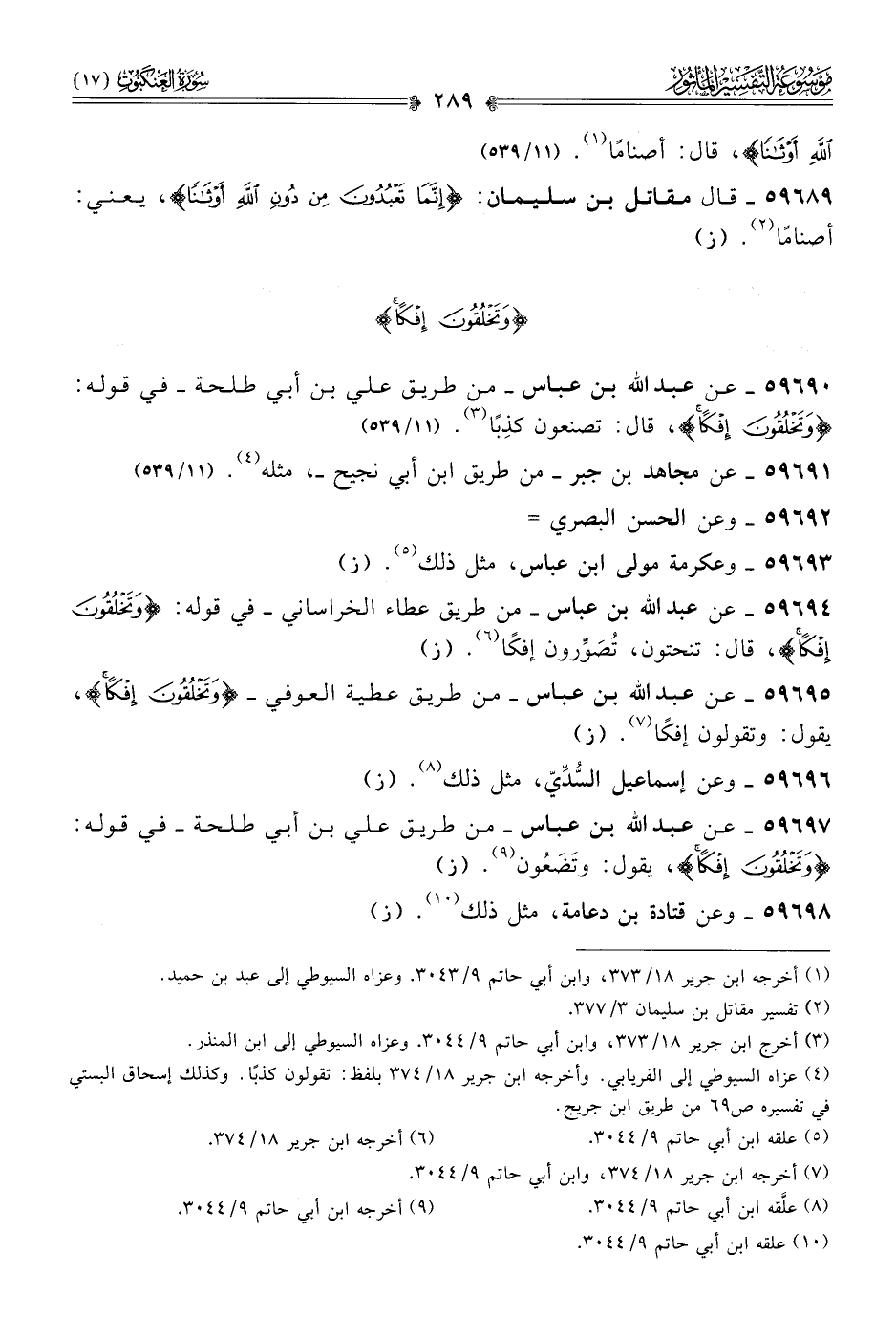 ٥٩٦٩٥ - عن عبد الله بن عباس -من طريق عطية العوفي- {وتخلقون إفكا}، يقول: وتقولون إفكًا (¬٧). (ز)