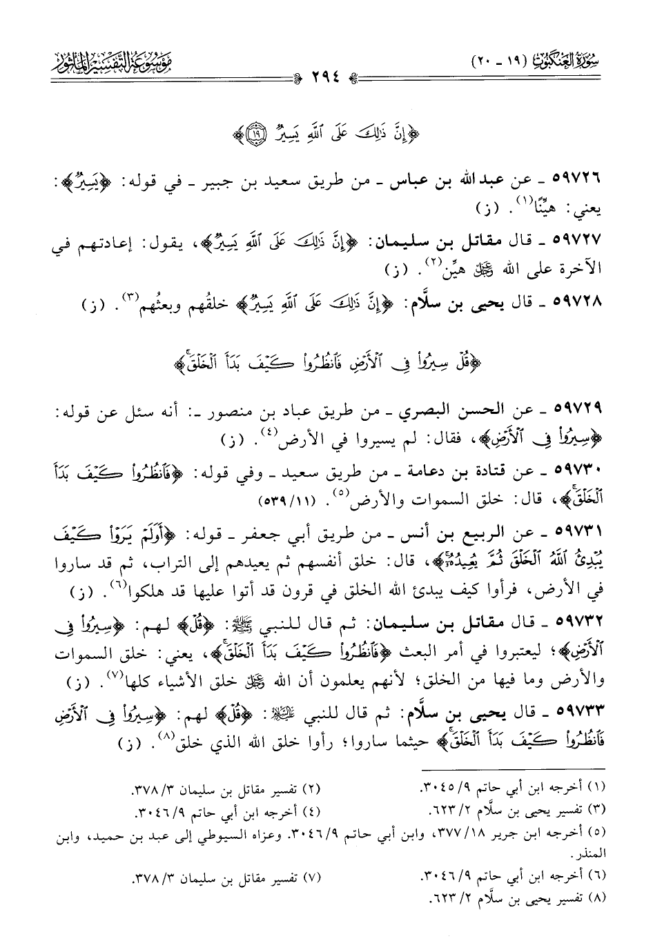 ٥٩٧٣٣ - قال يحيى بن سلّام: ثم قال للنبي - عليه السلام -: {قل} لهم: {سيروا في الأرض فانظروا كيف بدأ الخلق} حيثما ساروا؛ رأوا خلق الله الذي خلق (¬٨). (ز)