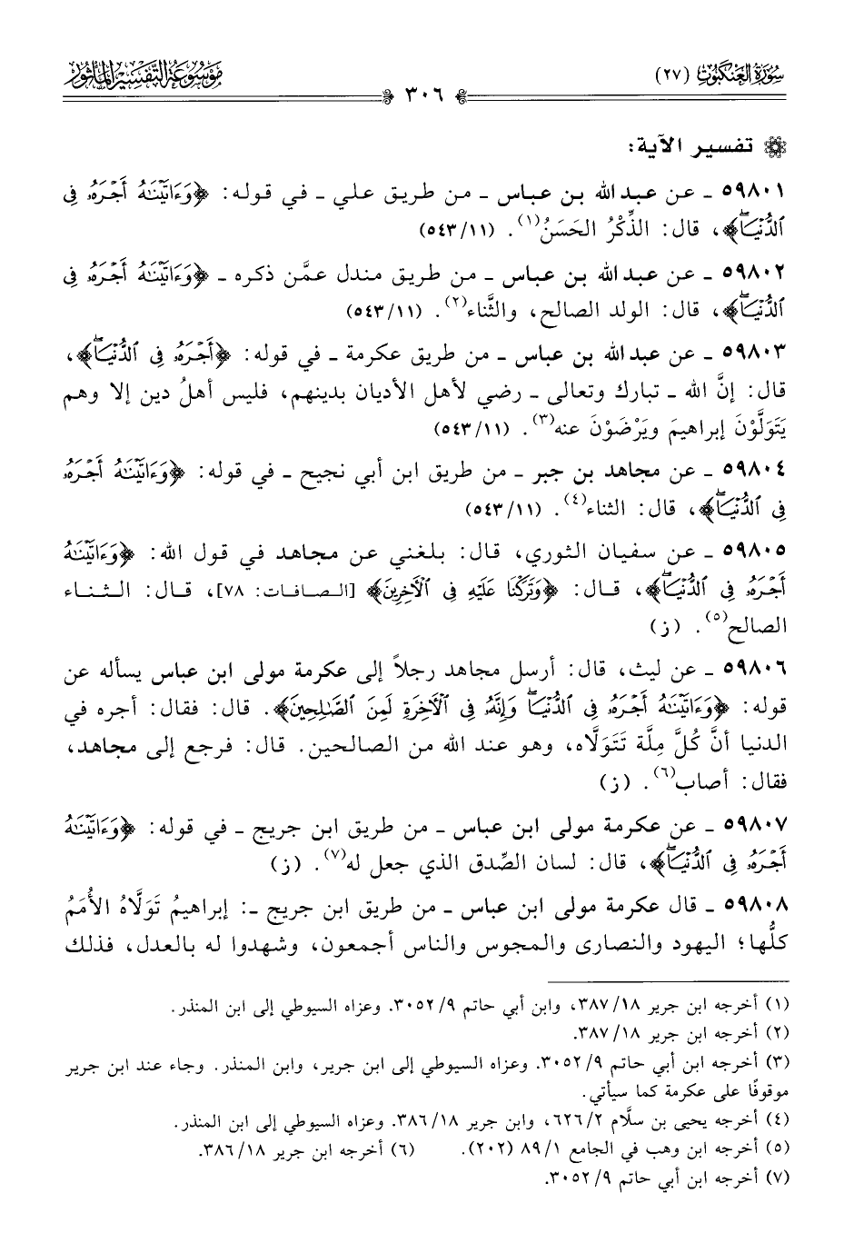 ٥٩٨٠٢ - عن عبد الله بن عباس -من طريق مندل عمَّن ذكره- {وآتيناه أجره في الدنيا}، قال: الولد الصالح، والثَّناء (¬٢).