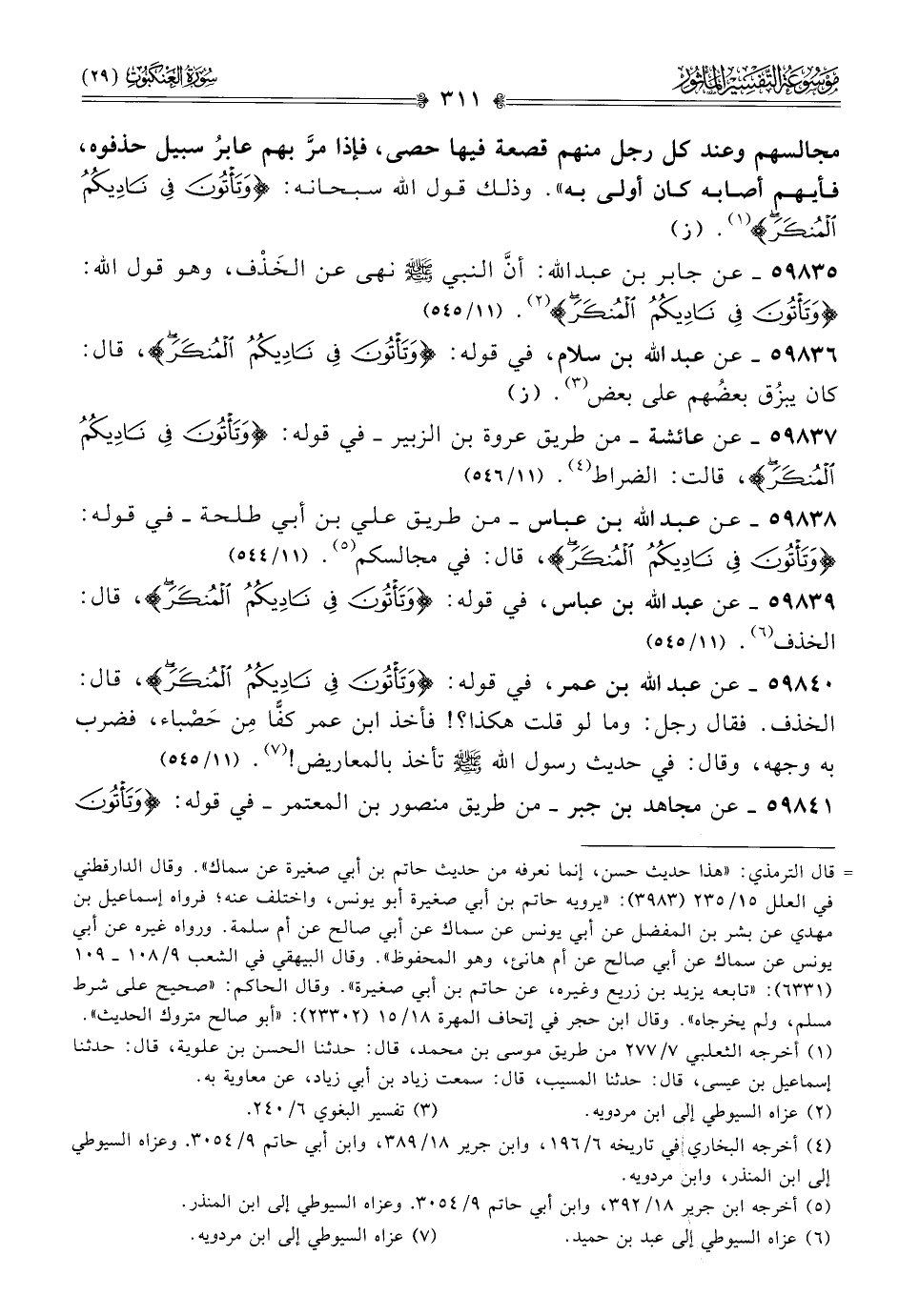 ٥٩٨٣٩ - عن عبد الله بن عباس، في قوله: {وتأتون في ناديكم المنكر}، قال: الخذف (¬٦). (١١/ ٥٤٥)