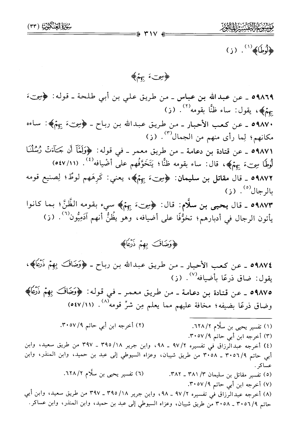 ٥٩٨٧٥ - عن قتادة بن دعامة -من طريق معمر- في قوله: {وضاق بهم ذرعا} وضاق ذرعًا بضيفه؛ مخافة عليهم مما يعلم مِن شرِّ قومه (¬٨). (١١/ ٥٤٧)