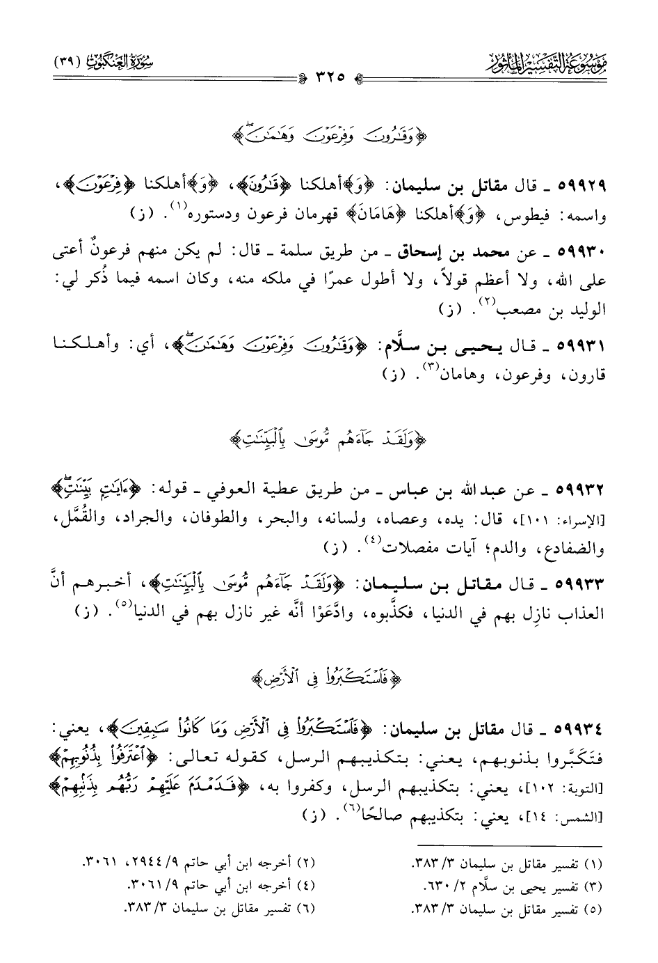 ٥٩٩٣١ - قال يحيى بن سلّام: {وقارون وفرعون وهامان}، أي: وأهلكنا قارون، وفرعون، وهامان (¬٣). (ز)