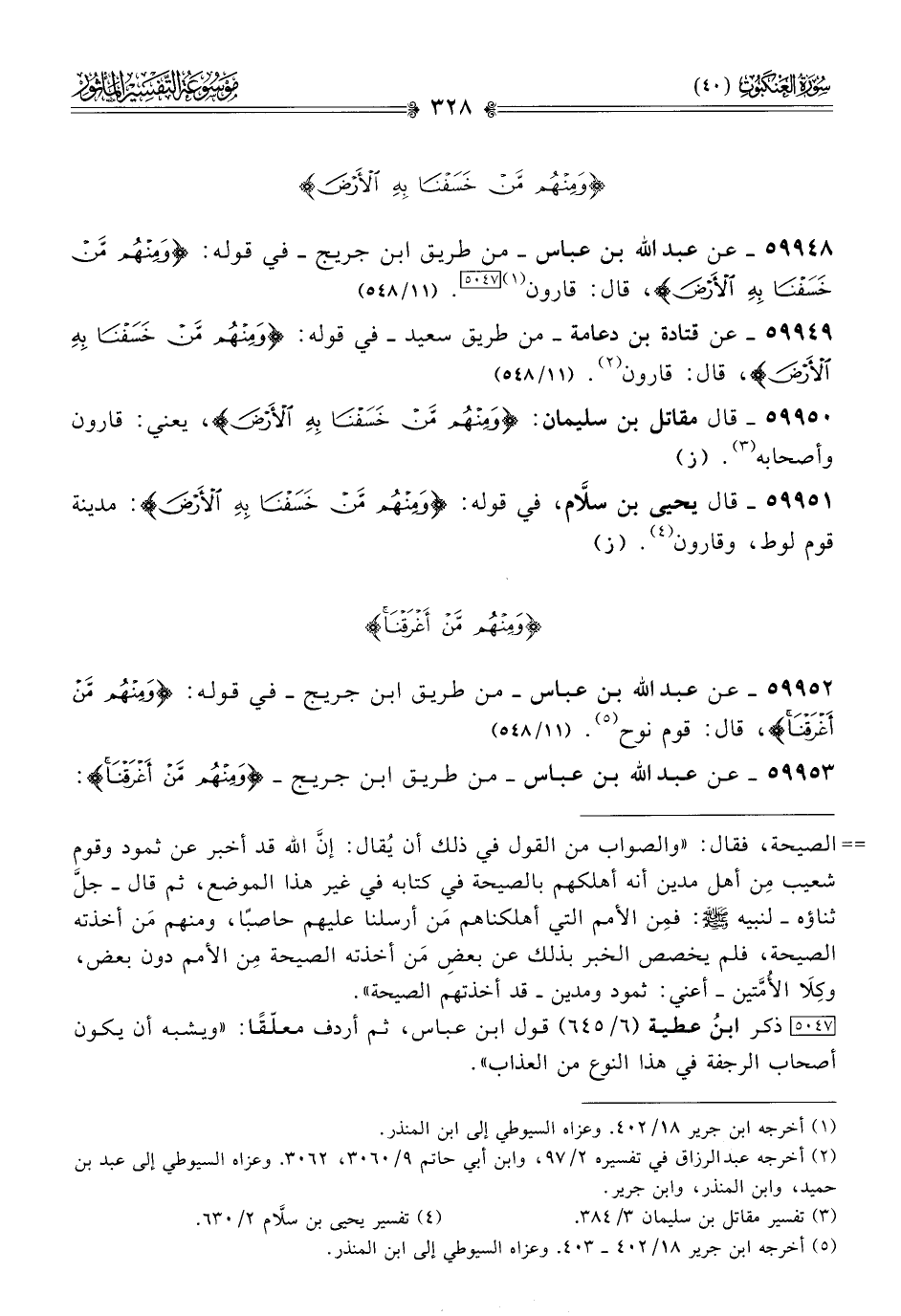 ٥٩٩٤٨ - عن عبد الله بن عباس -من طريق ابن جريج- في قوله: {ومنهم من خسفنا به الأرض}، قال: قارون (¬١)