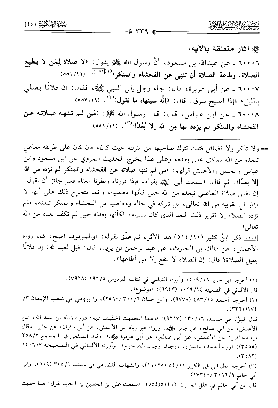 ٦٠٠٠٦ - عن عبد الله بن مسعود، أنّ رسول الله - صلى الله عليه وسلم - يقول: «لا صلاة لِمَن لا يطيع الصلاة، وطاعة الصلاة أن تنهى عن الفحشاء والمنكر» (¬١) [٥٠٥٤]. (١١/ ٥٥١)