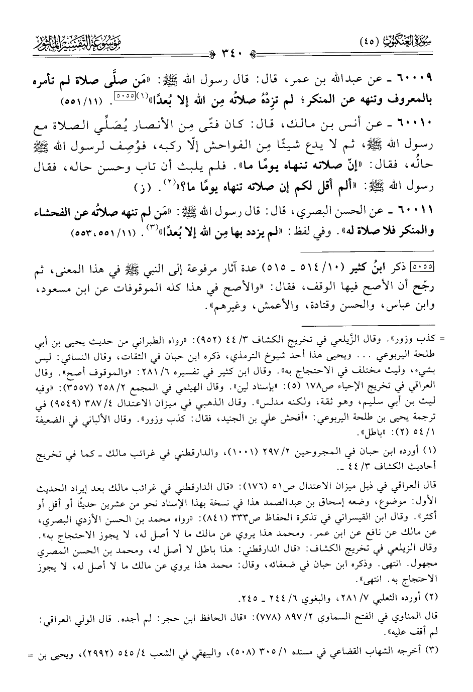 ٦٠٠١١ - عن الحسن البصري، قال: قال رسول الله - صلى الله عليه وسلم -: «مَن لم تنهه صلاتُه عن الفحشاء والمنكر فلا صلاة له». وفي لفظ: «لم يزدد بها مِن الله إلا بُعدًا» (¬٣). (١١/ ٥٥١، ٥٥٣)