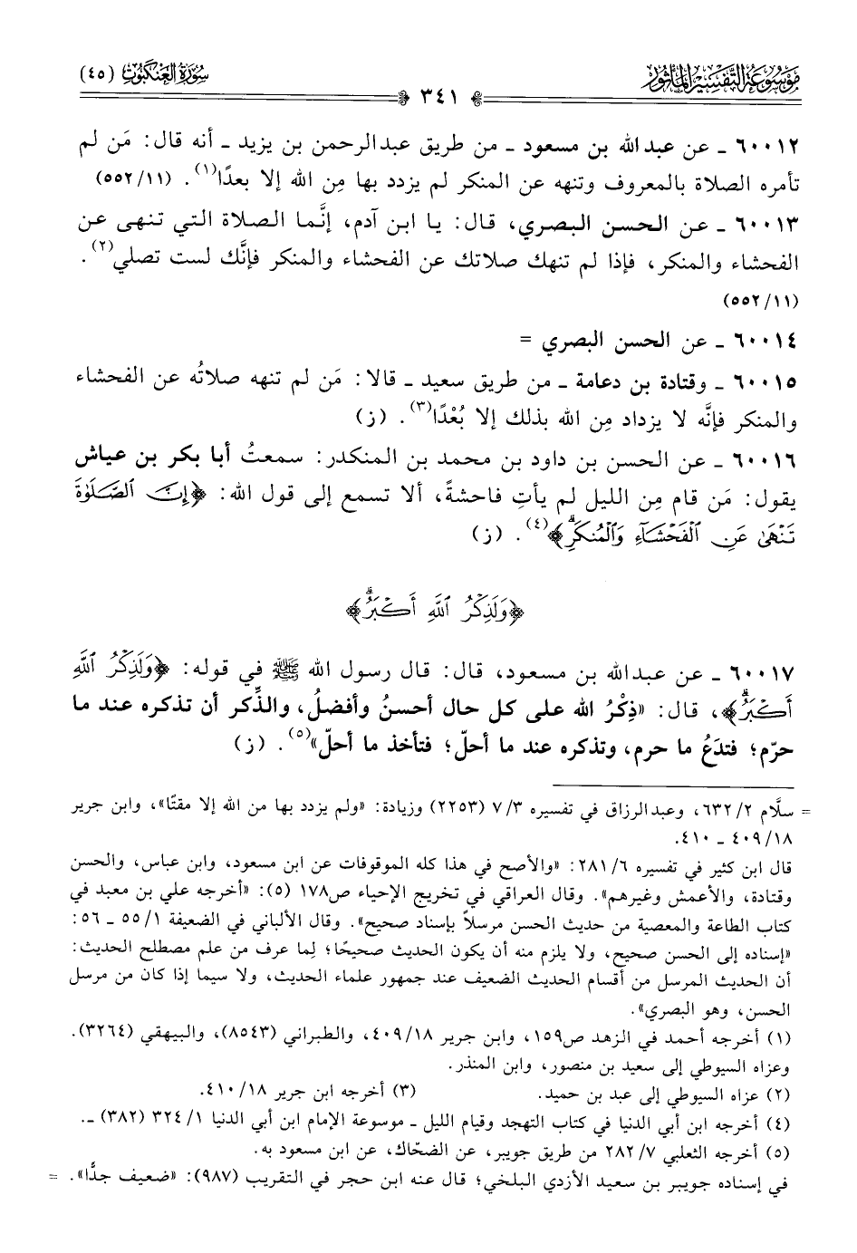 ٦٠٠١٧ - عن عبد الله بن مسعود، قال: قال رسول الله - صلى الله عليه وسلم - في قوله: {ولَذِكْرُ اللَّهِ أكْبَرُ}، قال: «ذِكْرُ الله على كل حال أحسنُ وأفضلُ، والذِّكر أن تذكره عند ما حرّم؛ فتدَعُ ما حرم، وتذكره عند ما أحلّ؛ فتأخذ ما أحلّ» (¬٥). (ز)