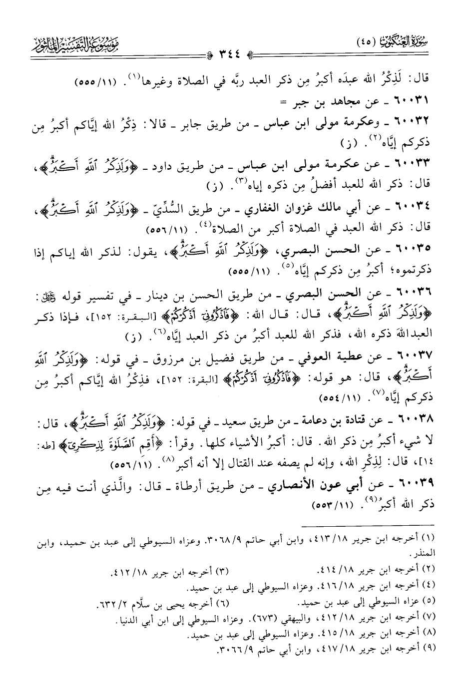 ٦٠٠٣٣ - عن عكرمة مولى ابن عباس -من طريق داود- {ولذكر الله أكبر}، قال: ذكر الله للعبد أفضلُ مِن ذكره إياه (¬٣). (ز)