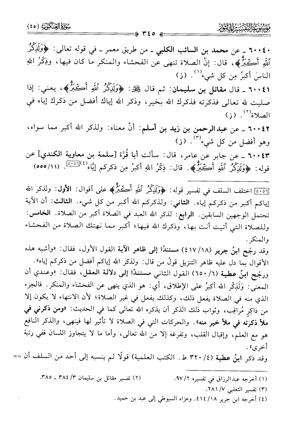 ٦٠٠٤٠ - عن محمد بن السائب الكلبي -من طريق معمر- في قوله تعالى: {ولذكر الله أكبر}، قال: إنّ الصلاة تنهى عن الفحشاء والمنكر ما كان فيها، وذِكْرُ اللهِ الناسَ أكبرُ مِن كل شيء (¬١). (ز)