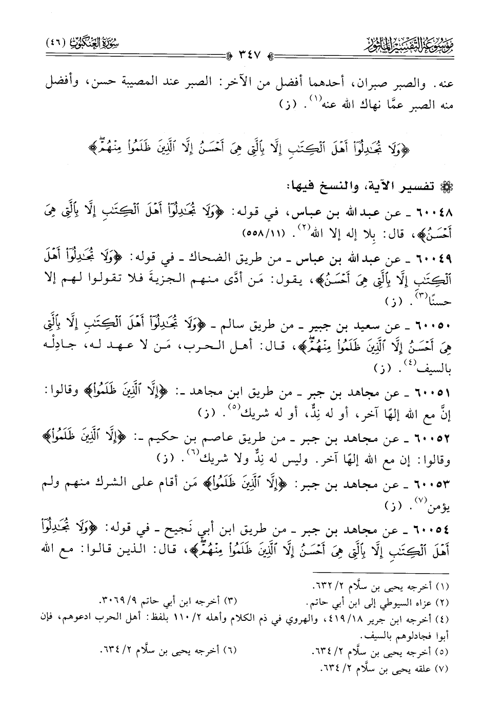 ٦٠٠٤٨ - عن عبد الله بن عباس، في قوله: {ولا تجادلوا أهل الكتاب إلا بالتي هي أحسن}، قال: بِلا إله إلا الله (¬٢).