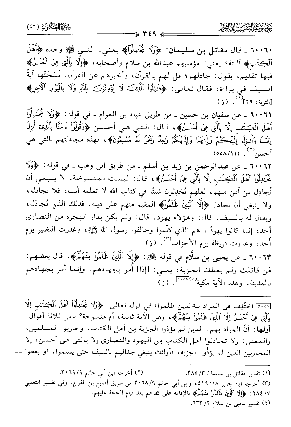 ٦٠٠٦٣ - عن يحيى بن سلّام في قوله - عز وجل -: {إلا الذين ظلموا منهم}، قال بعضهم: مَن قاتلك ولم يعطك الجزية، يعني: [إذا] أُمر بجهادهم. وإنما أمر بجهادهم بالمدينة، وهذه الآية مكية (¬٤) [٥٠٥٧]. (ز)